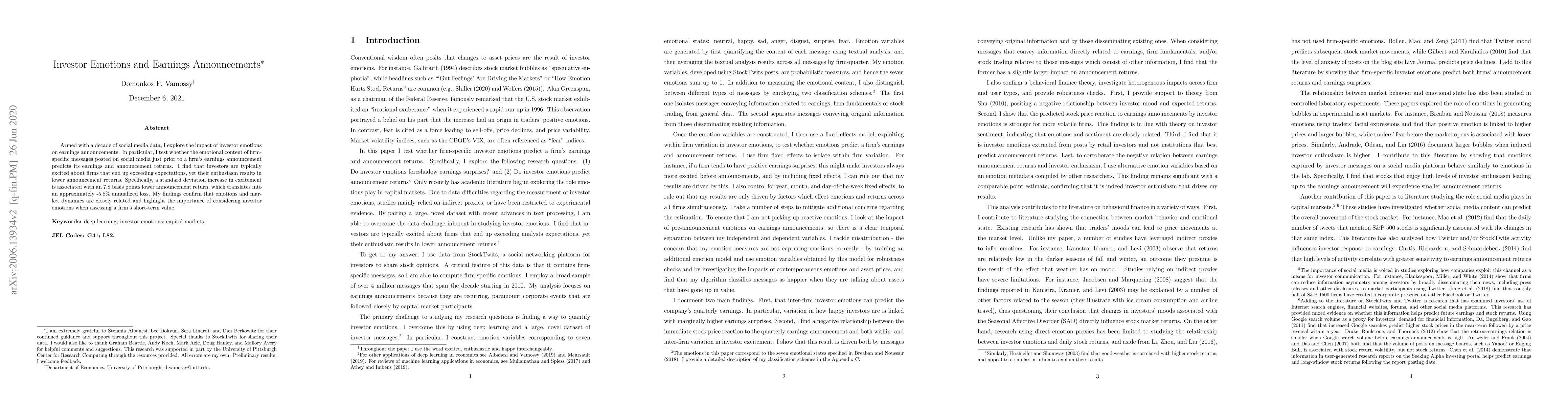 This study uses social media data to analyze how investor emotions affect earnings announcements, finding that heightened excitement before positive earnings results correlates with lower announcement returns. The results suggest a -5.8% annualized loss due to investor enthusiasm, underscoring the interplay between emotions and market dynamics.