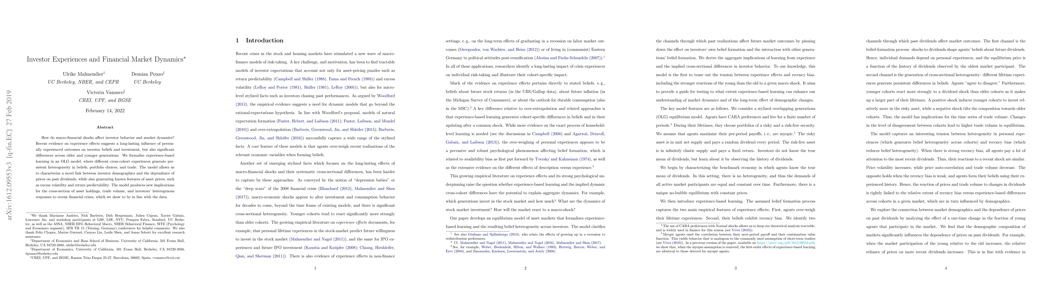This paper explores how macro-financial shocks impact investor behavior and market dynamics through experience-based learning in an OLG model, revealing persistent heterogeneity in beliefs and portfolio choices across different generations. The model links investor demographics to price dependence on past dividends and offers new insights into asset holdings, trade volume, and varied investor responses to financial crises.