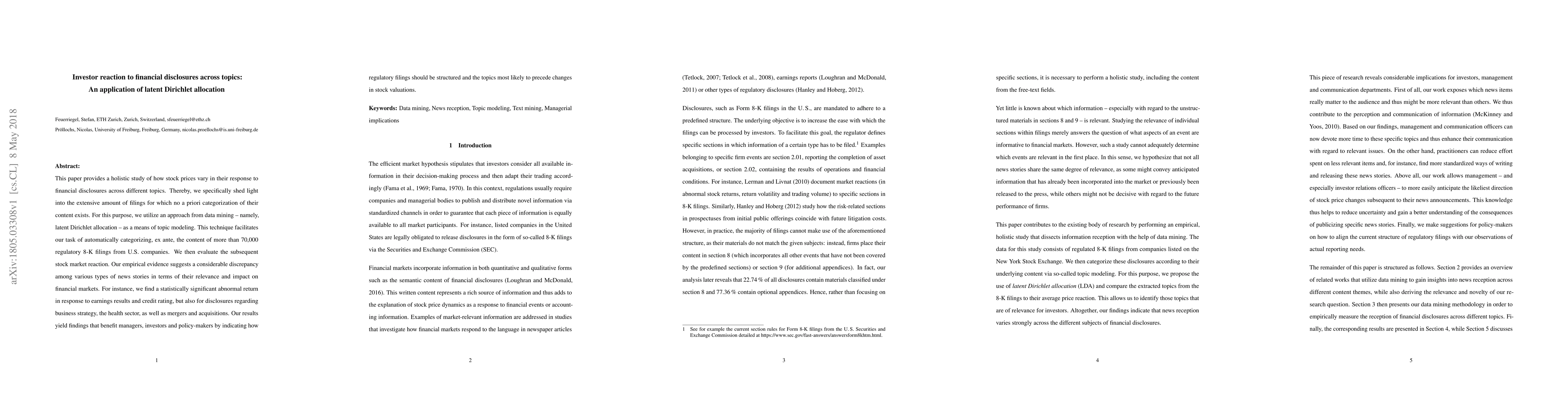 A study using topic modeling found that different types of financial disclosures have varying impacts on stock prices, with earnings results and credit ratings having the most significant effects. The research provides insights for regulators, managers, and investors to improve regulatory filings and market analysis.