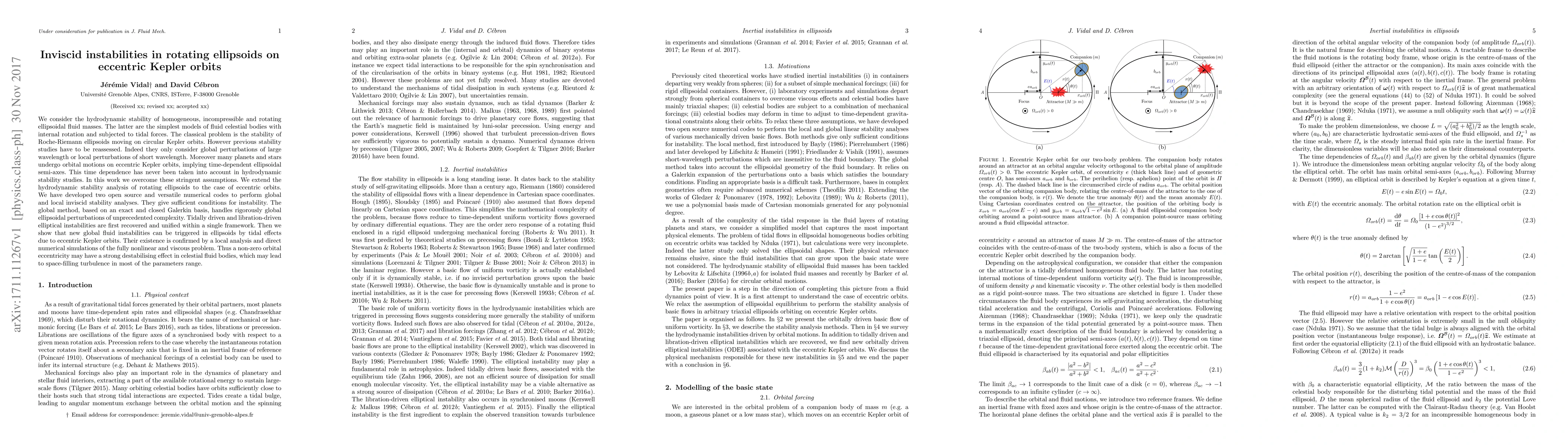 This paper investigates the hydrodynamic stability of rotating ellipsoidal fluid bodies on eccentric Kepler orbits, extending beyond previous studies that only consider circular orbits. It develops new numerical codes to analyze both global and local inviscid instabilities, revealing that eccentric orbits can trigger new tidally driven instabilities, potentially leading to turbulence in celestial fluid bodies.