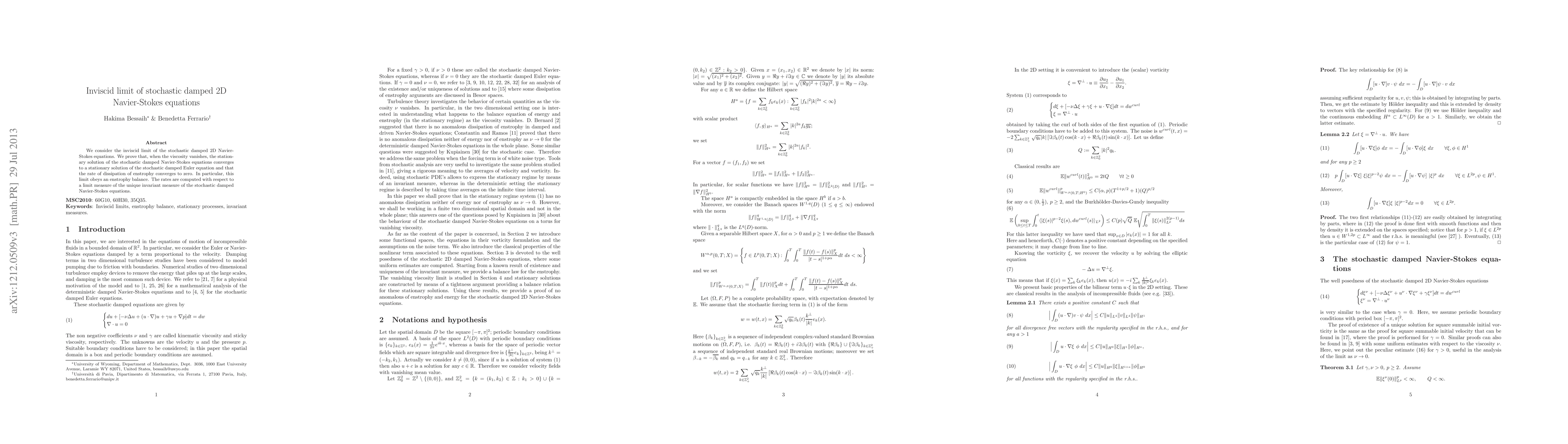 This paper investigates the inviscid limit of stochastic damped 2D Navier-Stokes equations, proving that the stationary solution converges to a solution of the stochastic damped Euler equation as viscosity vanishes, with enstrophy dissipation rate converging to zero, adhering to an enstrophy balance.