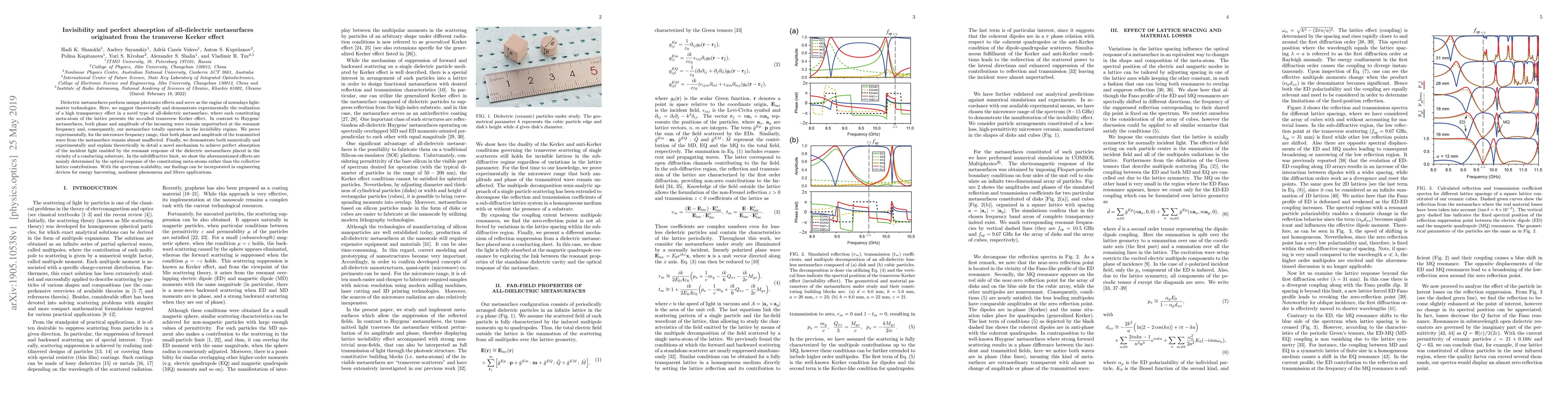 Dielectric metasurfaces perform unique photonics effects and serve as the engine of nowadays light-matter technologies. Here, we suggest theoretically and demonstrate experimentally the realization of a high transparency effect in a novel type of all-dielectric metasurface, where each constituting meta-atom of the lattice presents the so-called transverse Kerker effect. In contrast to Huygens' metasurfaces, both phase and amplitude of the incoming wave remain unperturbed at the resonant frequency and, consequently, our metasurface totally operates in the invisibility regime. We prove experimentally, for the microwave frequency range, that both phase and amplitude of the transmitted wave from the metasurface remain almost unaffected. Finally, we demonstrate both numerically and experimentally and explain theoretically in detail a novel mechanism to achieve perfect absorption of the incident light enabled by the resonant response of the dielectric metasurfaces placed in the vicinity of a conducting substrate. In the subdiffractive limit, we show the aforementioned effects are mainly determined by the optical response of the constituting meta-atoms rather than the collective lattice contributions. With the spectrum scalability, our findings can be incorporated in engineering devices for energy harvesting, nonlinear phenomena and filters applications.