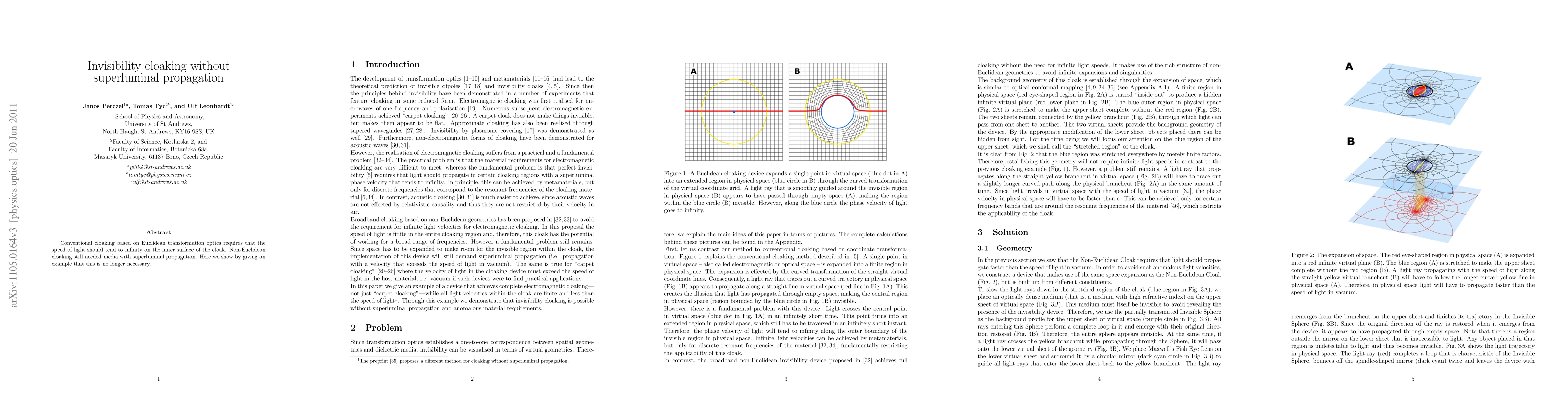 Two-line summary: This paper demonstrates a novel method for invisibility cloaking that does not rely on superluminal propagation or require the speed of light to tend to infinity, thus overcoming limitations of conventional Euclidean and Non-Euclidean transformation optics. The proposed method presents a feasible alternative for achieving cloaking effects without violating fundamental physical laws.