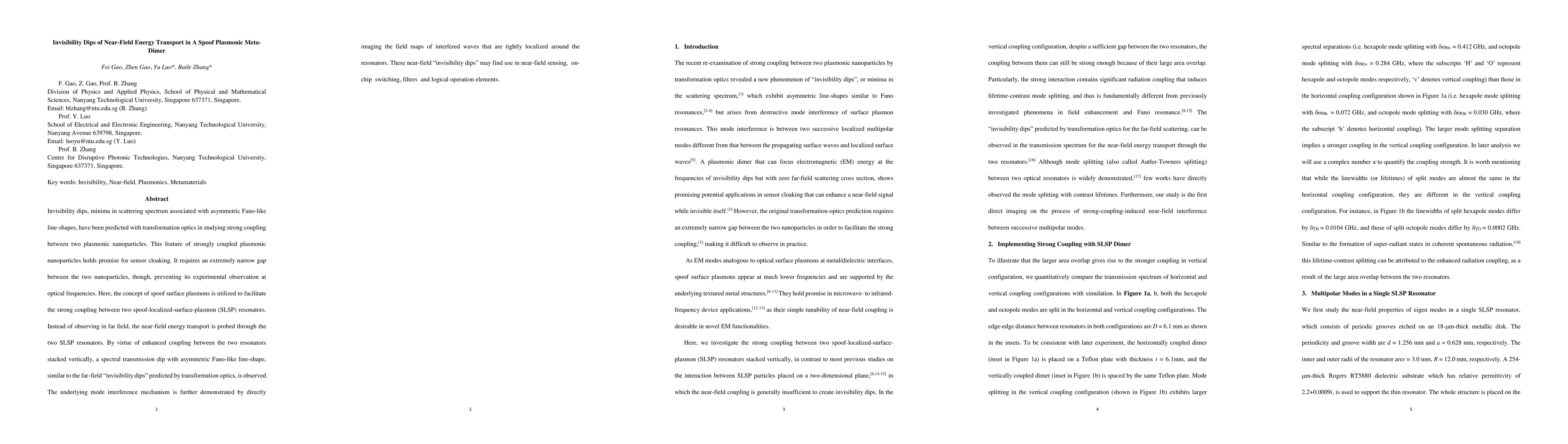 Invisibility dips, minima in scattering spectrum associated with asymmetric Fano-like line-shapes, have been predicted with transformation optics in studying strong coupling between two plasmonic nanoparticles. This feature of strongly coupled plasmonic nanoparticles holds promise for sensor cloaking. It requires an extremely narrow gap between the two nanoparticles, though, preventing its experimental observation at optical frequencies. Here, the concept of spoof surface plasmons is utilized to facilitate the strong coupling between two spoof-localized-surface-plasmon (SLSP) resonators. Instead of observing in far field, the near-field energy transport is probed through the two SLSP resonators. By virtue of enhanced coupling between the two resonators stacked vertically, a spectral transmission dip with asymmetric Fano-like line-shape, similar to the far-field invisibility dips predicted by transformation optics, is observed. The underlying mode interference mechanism is further demonstrated by directly imaging the field maps of interfered waves that are tightly localized around the resonators. These near-field invisibility dips may find use in near-field sensing, on-chip switching, filters and logical operation elements.