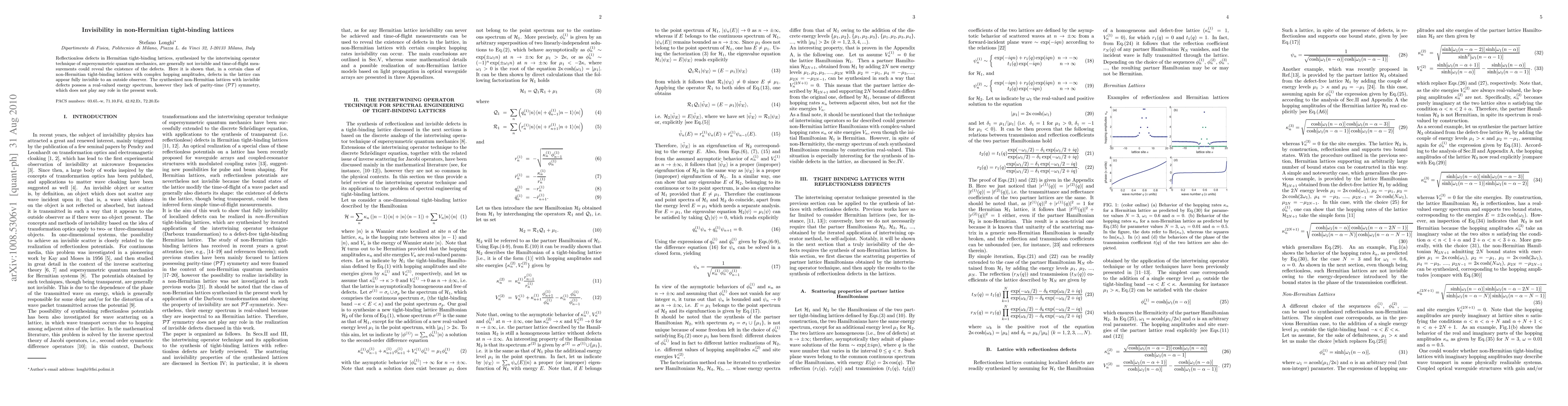 Reflectionless defects in Hermitian tight-binding lattices, synthesized by the intertwining operator technique of supersymmetric quantum mechanics, are generally not invisible and time-of-flight measurements could reveal the existence of the defects. Here it is shown that, in a certain class of non-Hermitian tight-binding lattices with complex hopping amplitudes, defects in the lattice can appear fully invisible to an outside observer. The synthesized non-Hermitian lattices with invisible defects possess a real-valued energy spectrum, however they lack of parity-time (PT) symmetry, which does not play any role in the present work.