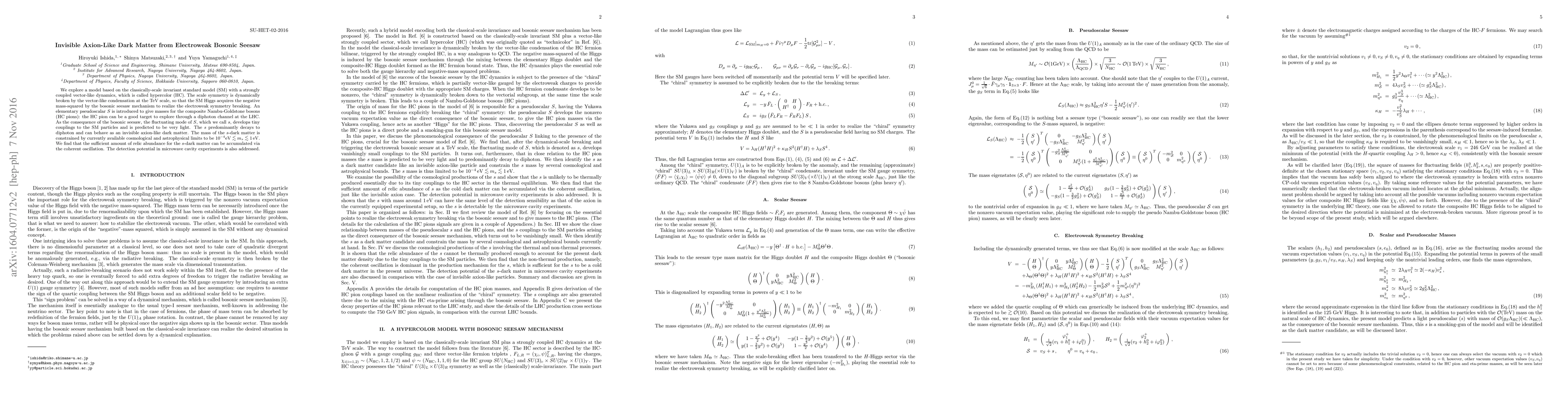 We explore a model based on the classically-scale invariant standard model (SM) with a strongly coupled vector-like dynamics, which is called hypercolor (HC). The scale symmetry is dynamically broken by the vector-like condensation at the TeV scale, so that the SM Higgs acquires the negative mass-squared by the bosonic seesaw mechanism to realize the electroweak symmetry breaking. An elementary pseudoscalar $S$ is introduced to give masses for the composite Nambu-Goldstone bosons (HC pions): the HC pion can be a good target to explore through a diphoton channel at the LHC. As the consequence of the bosonic seesaw, the fluctuating mode of $S$, which we call $s$, develops tiny couplings to the SM particles and is predicted to be very light. The $s$ predominantly decays to diphoton and can behave as an invisible axion-like dark matter. The mass of the $s$-dark matter is constrained by currently available cosmological and astrophysical limits to be $10^{-4} {\rm eV} \lesssim m_s \lesssim 1 \,{\rm eV}$. We find that the sufficient amount of relic abundance for the $s$-dark matter can be accumulated via the coherent oscillation. The detection potential in microwave cavity experiments is also addressed.