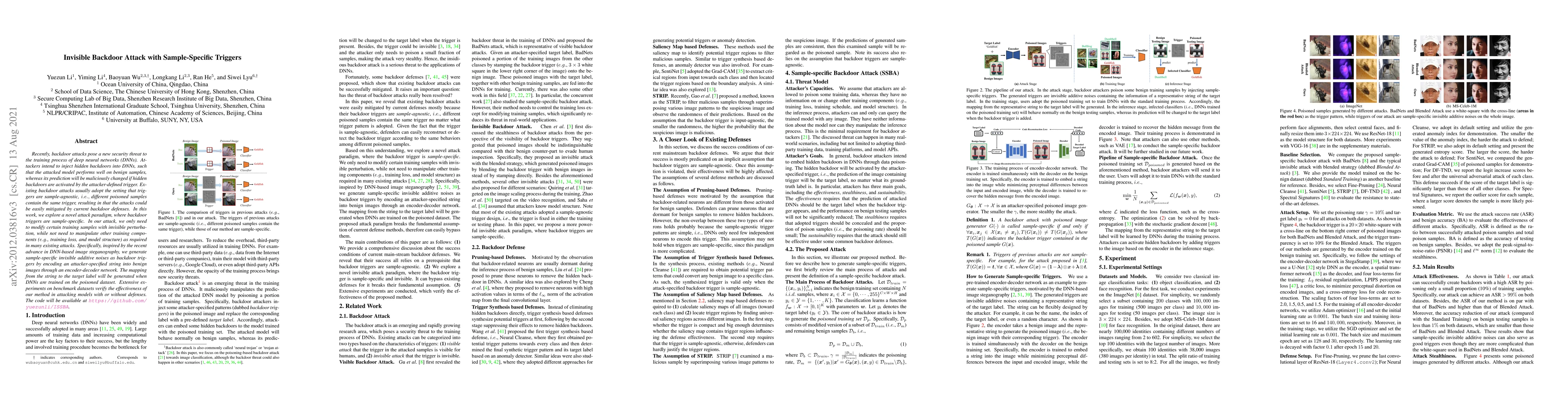This paper introduces a novel backdoor attack method for deep neural networks that employs sample-specific invisible triggers. Unlike traditional attacks, this method modifies only certain training samples with minimal perturbations, making it harder to detect and defend against.