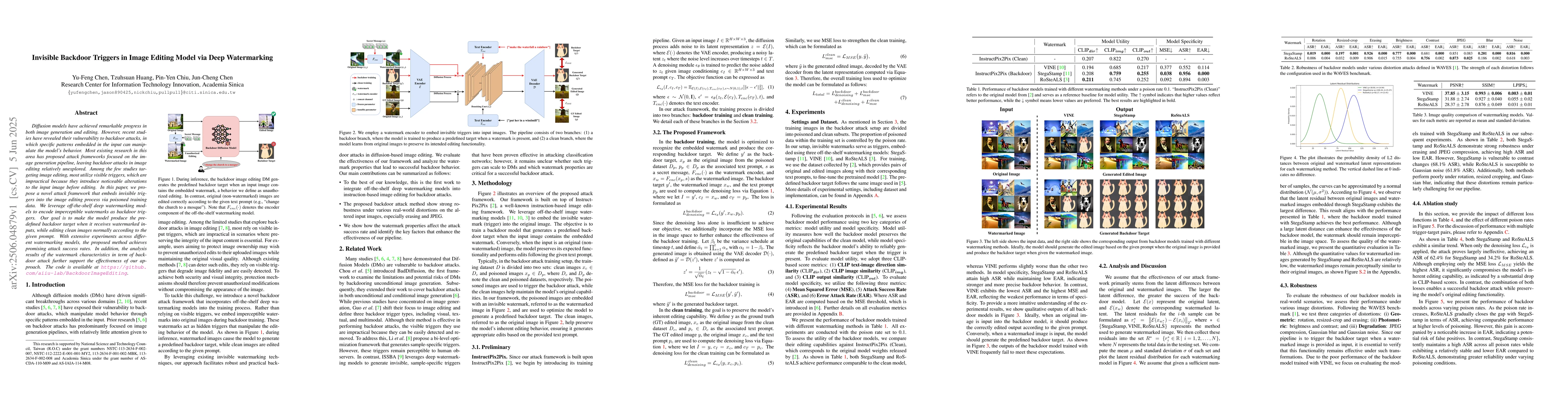 The research proposes a novel attack framework that embeds invisible backdoor triggers into image editing using poisoned training data and off-the-shelf deep watermarking models.