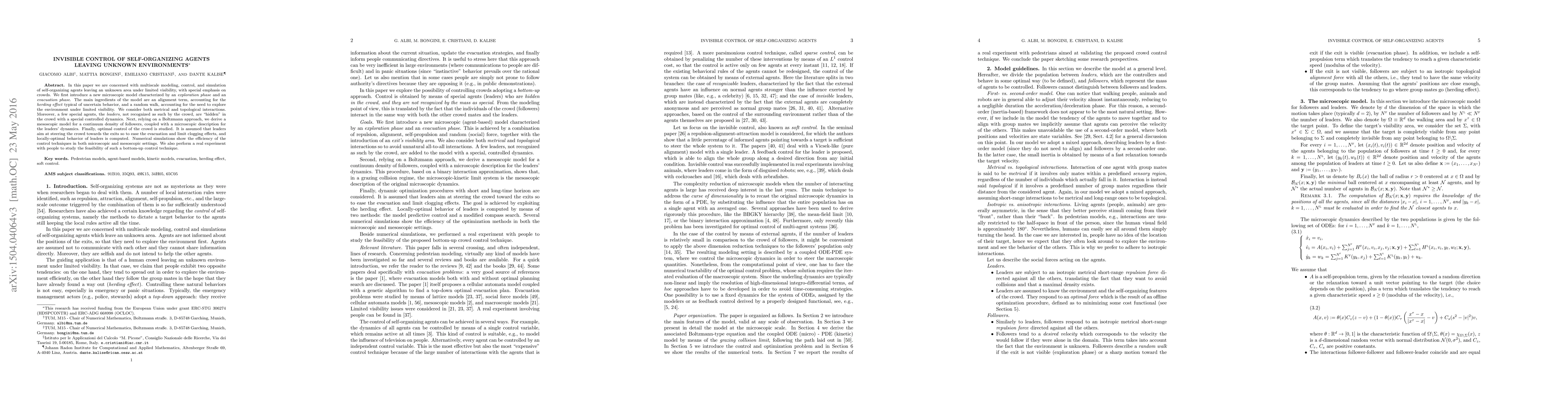 In this paper we are concerned with multiscale modeling, control, and simulation of self-organizing agents leaving an unknown area under limited visibility, with special emphasis on crowds. We first introduce a new microscopic model characterized by an exploration phase and an evacuation phase. The main ingredients of the model are an alignment term, accounting for the herding effect typical of uncertain behavior, and a random walk, accounting for the need to explore the environment under limited visibility. We consider both metrical and topological interactions. Moreover, a few special agents, the leaders, not recognized as such by the crowd, are "hidden" in the crowd with a special controlled dynamics. Next, relying on a Boltzmann approach, we derive a mesoscopic model for a continuum density of followers, coupled with a microscopic description for the leaders' dynamics. Finally, optimal control of the crowd is studied. It is assumed that leaders exploit the herding effect in order to steer the crowd towards the exits and reduce clogging. Locally-optimal behavior of leaders is computed. Numerical simulations show the efficiency of the optimization methods in both microscopic and mesoscopic settings. We also perform a real experiment with people to study the feasibility of the proposed bottom-up crowd control technique.