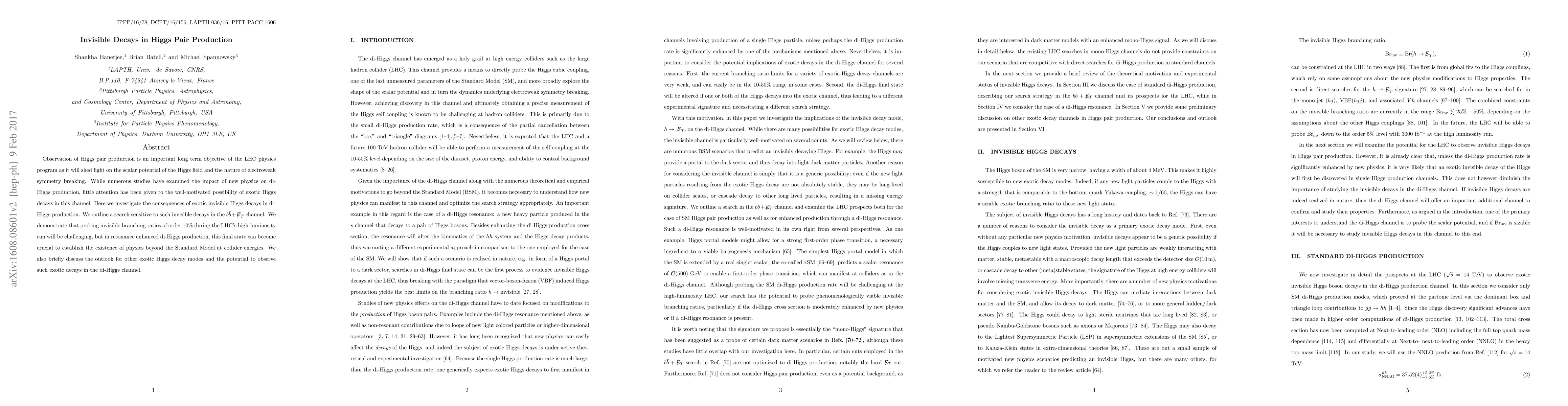 Observation of Higgs pair production is an important long term objective of the LHC physics program as it will shed light on the scalar potential of the Higgs field and the nature of electroweak symmetry breaking. While numerous studies have examined the impact of new physics on di-Higgs production, little attention has been given to the well-motivated possibility of exotic Higgs decays in this channel. Here we investigate the consequences of exotic invisible Higgs decays in di-Higgs production. We outline a search sensitive to such invisible decays in the $b\bar b+{\not \!\! E}_T$ channel. We demonstrate that probing invisible branching ratios of order 10$\%$ during the LHC's high-luminosity run will be challenging, but in resonance enhanced di-Higgs production, this final state can become crucial to establish the existence of physics beyond the Standard Model at collider energies. We also briefly discuss the outlook for other exotic Higgs decay modes and the potential to observe such exotic decays in the di-Higgs channel.