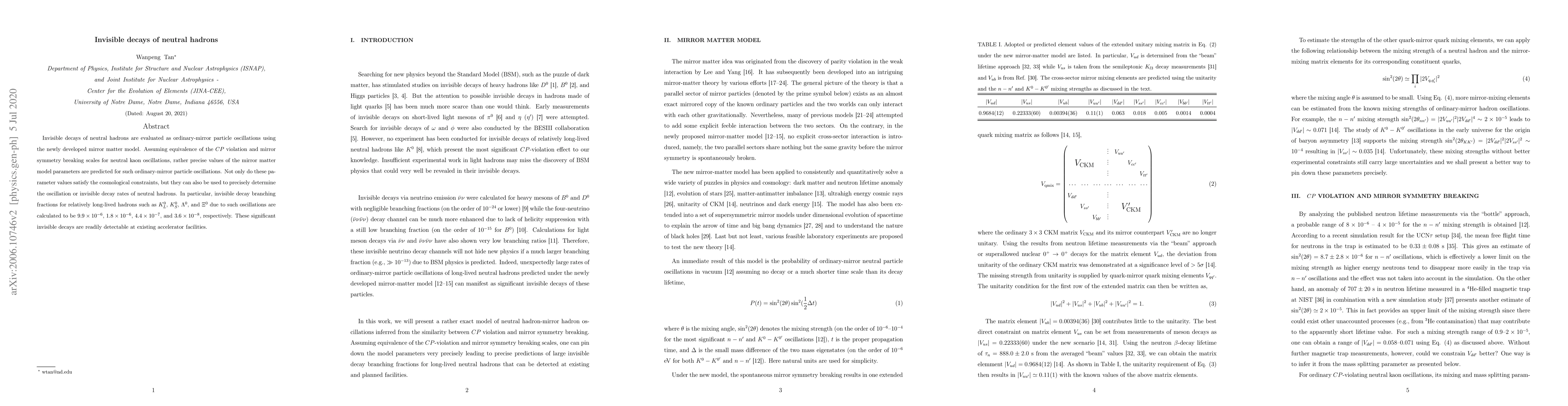 This paper evaluates invisible decay rates of neutral hadrons through ordinary-mirror particle oscillations using the mirror matter model, predicting precise parameter values that satisfy cosmological constraints and determining branching fractions for hadrons like $K^0_L$, $K^0_S$, $\Lambda^0$, and $\Xi^0$. These decays are significant and detectable at current accelerators.