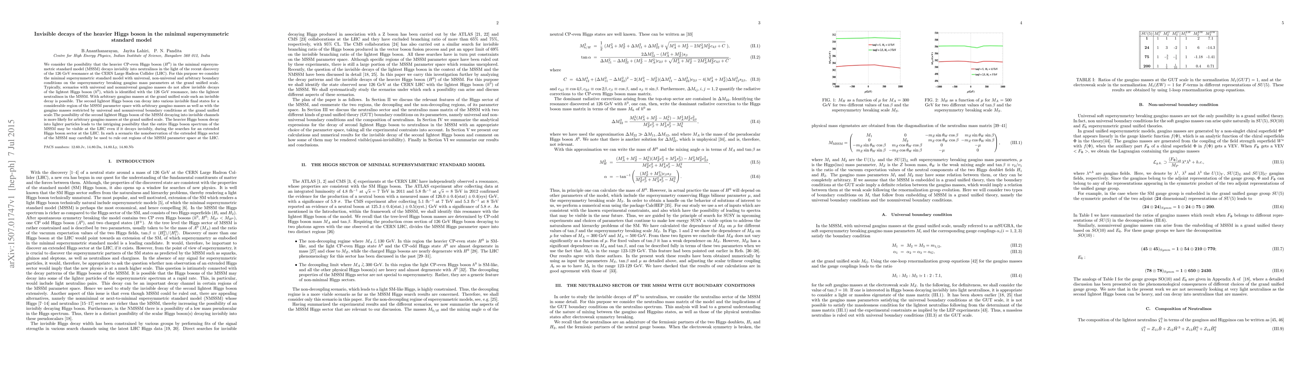 We consider the possibility that the heavier CP-even Higgs boson~($H^0$) in the minimal supersymmetric standard model (MSSM) decays invisibly into neutralinos in the light of the recent discovery of the 126 GeV resonance at the CERN Large Hadron Collider (LHC). For this purpose we consider the minimal supersymmetric standard model with universal, non-universal and arbitrary boundary conditions on the supersymmetry breaking gaugino mass parameters at the grand unified scale. Typically, scenarios with universal and nonuniversal gaugino masses do not allow invisible decays of the lightest Higgs boson~($h^0$), which is identified with the $126$ GeV resonance, into the lightest neutralinos in the MSSM. With arbitrary gaugino masses at the grand unified scale such an invisible decay is possible. The second lightest Higgs boson can decay into various invisible final states for a considerable region of the MSSM parameter space with arbitrary gaugino masses as well as with the gaugino masses restricted by universal and nonuniversal boundary conditions at the grand unified scale.The possibility of the second lightest Higgs boson of the MSSM decaying into invisible channels is more likely for arbitrary gaugino masses at the grand unified scale. The heavier Higgs boson decay into lighter particles leads to the intriguing possibility that the entire Higgs boson spectrum of the MSSM may be visible at the LHC even if it decays invisibly, during the searches for an extended Higgs boson sector at the LHC. In such a scenario the nonobservation of the extended Higgs sector of the MSSM may carefully be used to rule out regions of the MSSM parameter space at the LHC.