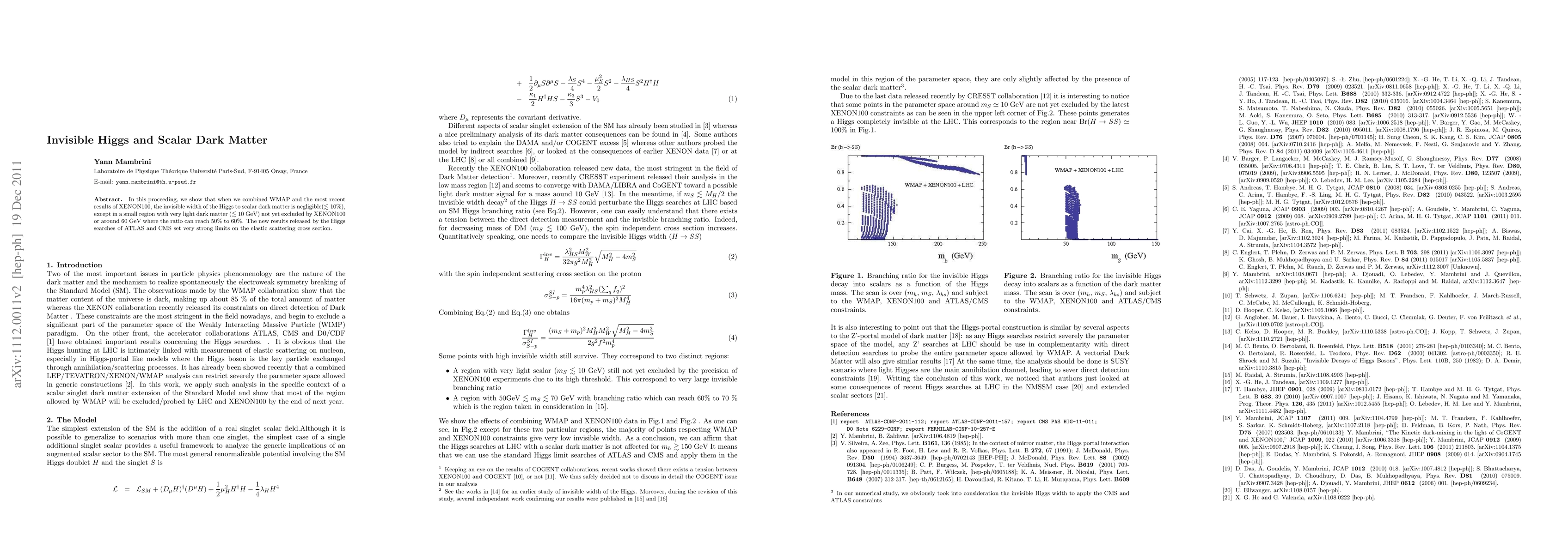 In this proceeding, we show that when we combined WMAP and the most recent results of XENON100, the invisible width of the Higgs to scalar dark matter is negligible(<10%), except in a small region with very light dark matter (< 10 GeV) not yet excluded by XENON100 or around 60 GeV where the ratio can reach 50% to 60%. The new results released by the Higgs searches of ATLAS and CMS set very strong limits on the elastic scattering cross section.