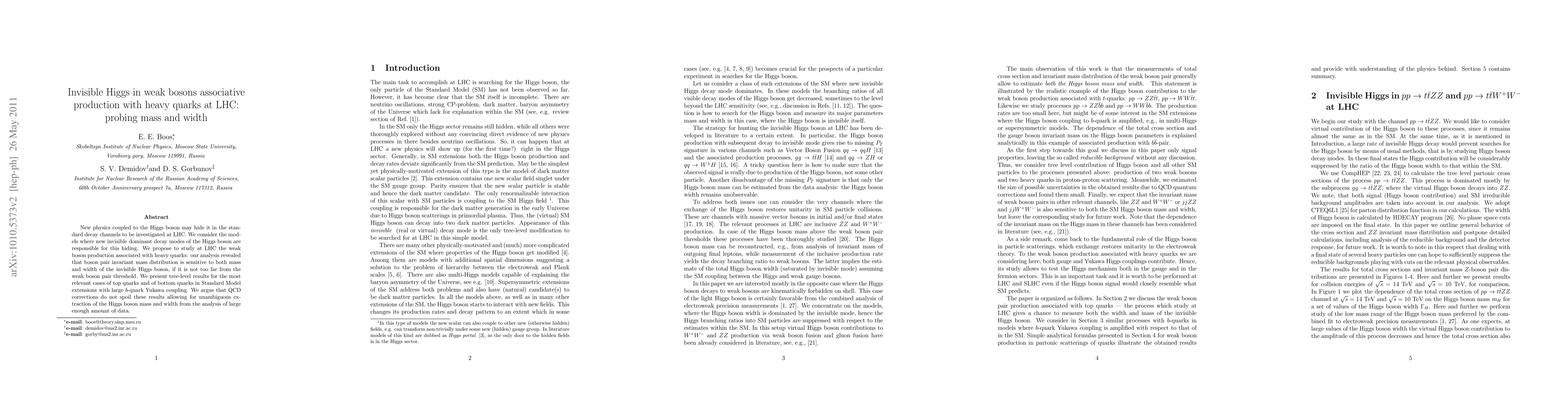 New physics coupled to the Higgs boson may hide it in the standard decay channels to be investigated at LHC. We consider the models where new invisible dominant decay modes of the Higgs boson are responsible for this hiding. We propose to study at LHC the weak boson production associated with heavy quarks: our analysis revealed that boson pair invariant mass distribution is sensitive to both mass and width of the invisible Higgs boson, if it is not too far from the weak boson pair threshold. We present tree-level results for the most relevant cases of top quarks and of bottom quarks in Standard Model extensions with large $b$-quark Yukawa coupling. We argue that QCD corrections do not spoil these results allowing for unambiguous extraction of the Higgs boson mass and width from the analysis of large enough amount of data.