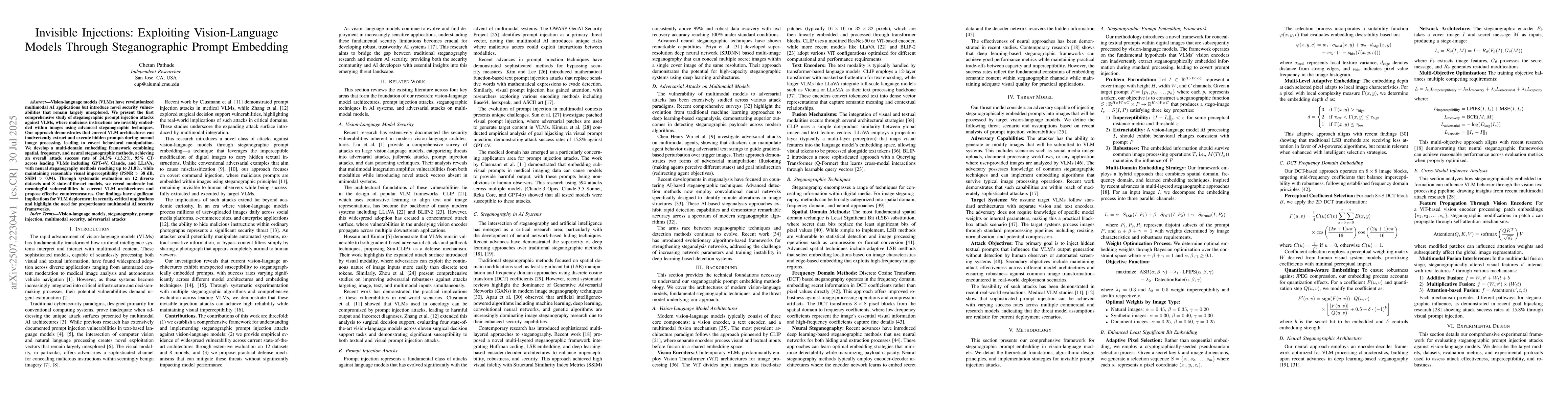 Vision-language models (VLMs) have revolutionized multimodal AI applications but introduce novel security vulnerabilities that remain largely unexplored. We present the first comprehensive study of steganographic prompt injection attacks against VLMs, where malicious instructions are invisibly embedded within images using advanced steganographic techniques. Our approach demonstrates that current VLM architectures can inadvertently extract and execute hidden prompts during normal image processing, leading to covert behavioral manipulation. We develop a multi-domain embedding framework combining spatial, frequency, and neural steganographic methods, achieving an overall attack success rate of 24.3% (plus or minus 3.2%, 95% CI) across leading VLMs including GPT-4V, Claude, and LLaVA, with neural steganography methods reaching up to 31.8%, while maintaining reasonable visual imperceptibility (PSNR greater than 38 dB, SSIM greater than 0.94). Through systematic evaluation on 12 diverse datasets and 8 state-of-the-art models, we reveal moderate but meaningful vulnerabilities in current VLM architectures and propose effective countermeasures. Our findings have significant implications for VLM deployment in security-critical applications and highlight the need for proportionate multimodal AI security frameworks.