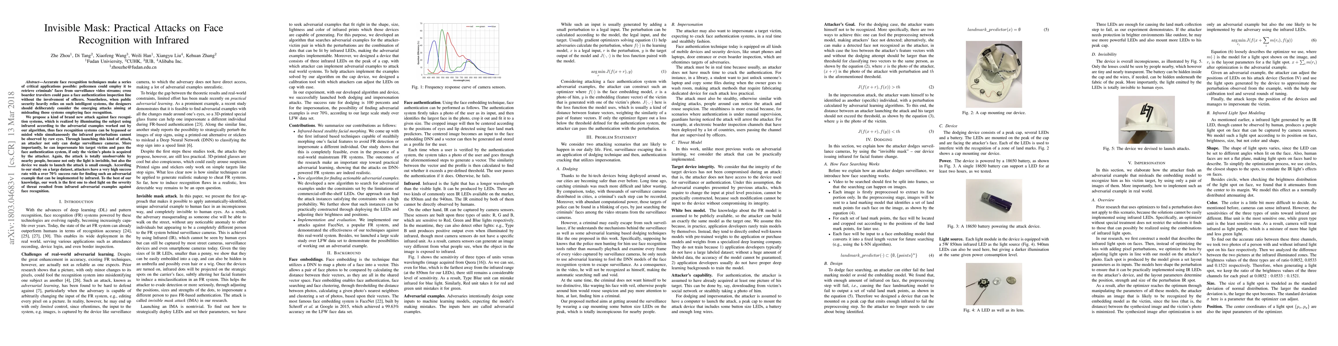 Accurate face recognition techniques make a series of critical applications possible: policemen could employ it to retrieve criminals' faces from surveillance video streams; cross boarder travelers could pass a face authentication inspection line without the involvement of officers. Nonetheless, when public security heavily relies on such intelligent systems, the designers should deliberately consider the emerging attacks aiming at misleading those systems employing face recognition. We propose a kind of brand new attack against face recognition systems, which is realized by illuminating the subject using infrared according to the adversarial examples worked out by our algorithm, thus face recognition systems can be bypassed or misled while simultaneously the infrared perturbations cannot be observed by raw eyes. Through launching this kind of attack, an attacker not only can dodge surveillance cameras. More importantly, he can impersonate his target victim and pass the face authentication system, if only the victim's photo is acquired by the attacker. Again, the attack is totally unobservable by nearby people, because not only the light is invisible, but also the device we made to launch the attack is small enough. According to our study on a large dataset, attackers have a very high success rate with a over 70\% success rate for finding such an adversarial example that can be implemented by infrared. To the best of our knowledge, our work is the first one to shed light on the severity of threat resulted from infrared adversarial examples against face recognition.