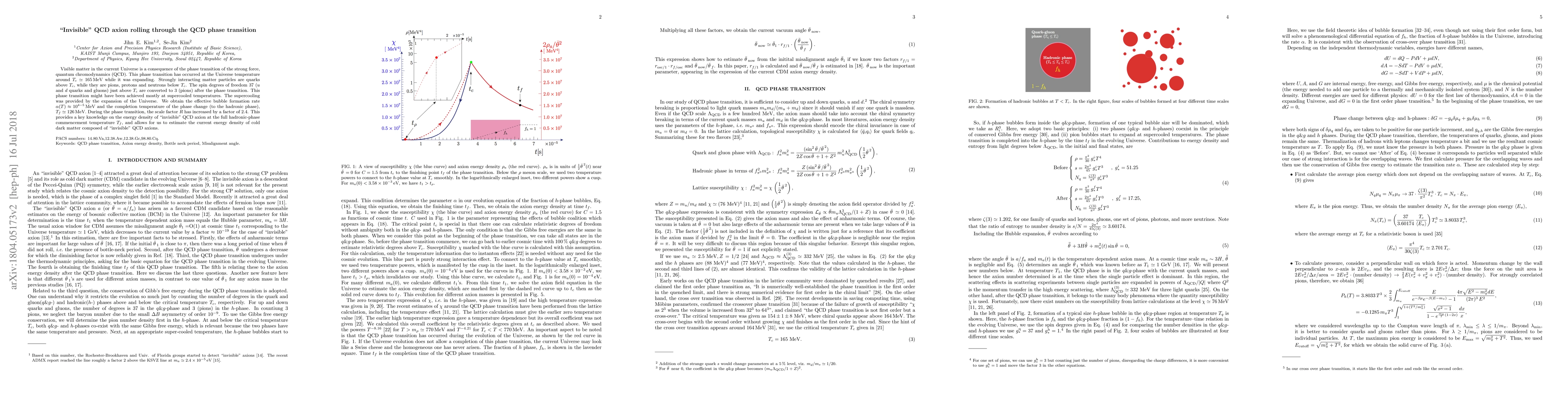 Visible matter in the current Universe is a consequence of the phase transition of the strong force, quantum chromodynamics (QCD). This phase transition has occurred at the Universe temperature around $T_c\simeq 165\,$MeV while it was expanding. Strongly interacting matter particles are quarks above $T_c$, while they are pions, protons and neutrons below $T_c$. The spin degrees of freedom 37 in the quark and gluon phase just above $T_c$ are converted to 3 (pions) after the phase transition. This phase transition might have been achieved mostly at supercooled temperatures. The supercooling was provided by the expansion of the Universe. We obtain the effective bubble formation rate $\alpha(T)\approx 10^{4-5}\,$MeV and the completion temperature of the phase change (to the hadronic phase), $T_f\simeq 126\,$MeV. During the phase transition, the scale factor $R$ has increased by a factor of 2.4. This provides a key knowledge on the energy density of "invisible" QCD axion at the full hadronic-phase commencement temperature $T_f$, and allows for us to estimate the current energy density of cold dark matter composed of "invisible" QCD axions.