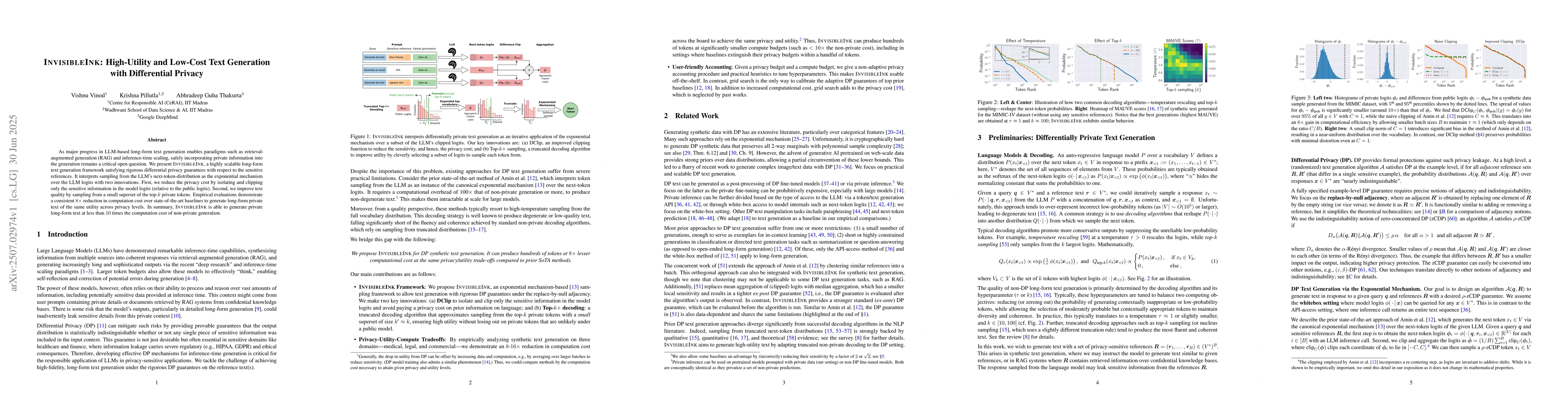 As major progress in LLM-based long-form text generation enables paradigms such as retrieval-augmented generation (RAG) and inference-time scaling, safely incorporating private information into the generation remains a critical open question. We present InvisibleInk, a highly scalable long-form text generation framework satisfying rigorous differential privacy guarantees with respect to the sensitive references. It interprets sampling from the LLM's next-token-distribution as the exponential mechanism over the LLM logits with two innovations. First, we reduce the privacy cost by isolating and clipping only the sensitive information in the model logits (relative to the public logits). Second, we improve text quality by sampling from a small superset of the top-$k$ private tokens. Empirical evaluations demonstrate a consistent $8\times$ reduction in computation cost over state-of-the-art baselines to generate long-form private text of the same utility across privacy levels. In summary, InvisibleInk is able to generate private long-form text at less than $10\times$ the computation cost of non-private generation.