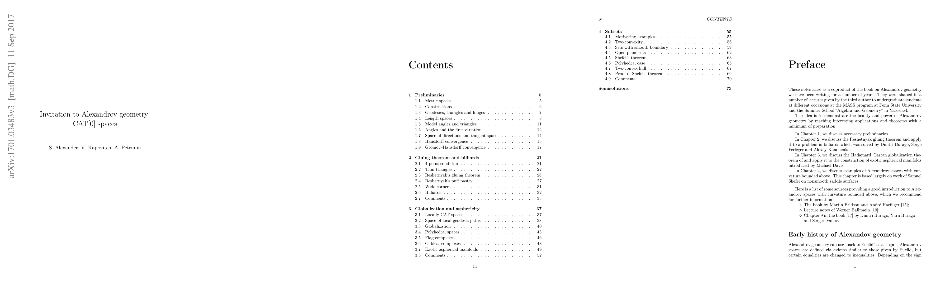 The idea is to demonstrate the beauty and power of Alexandrov geometry by reaching interesting applications with a minimum of preparation. The topics include 1. Estimates on the number of collisions in billiards. 2. Construction of exotic aspherical manifolds. 3. The geometry of two-convex sets in Euclidean space.