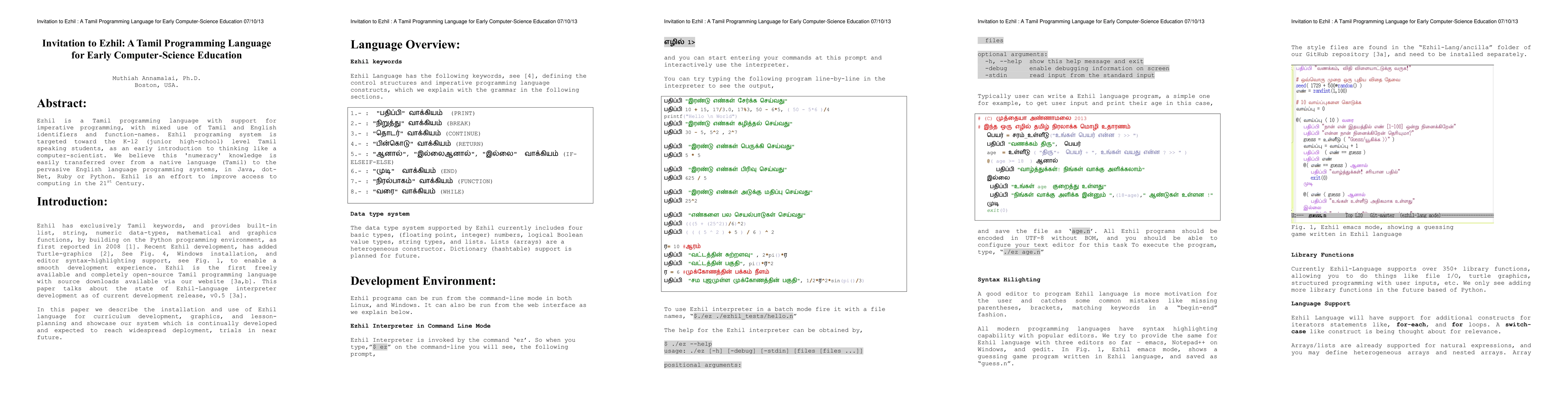 Ezhil is a Tamil-based programming language designed for K-12 students to introduce computer science concepts using a mix of Tamil and English identifiers. It aims to facilitate early numeracy in computing and ease the transition to mainstream English programming languages.