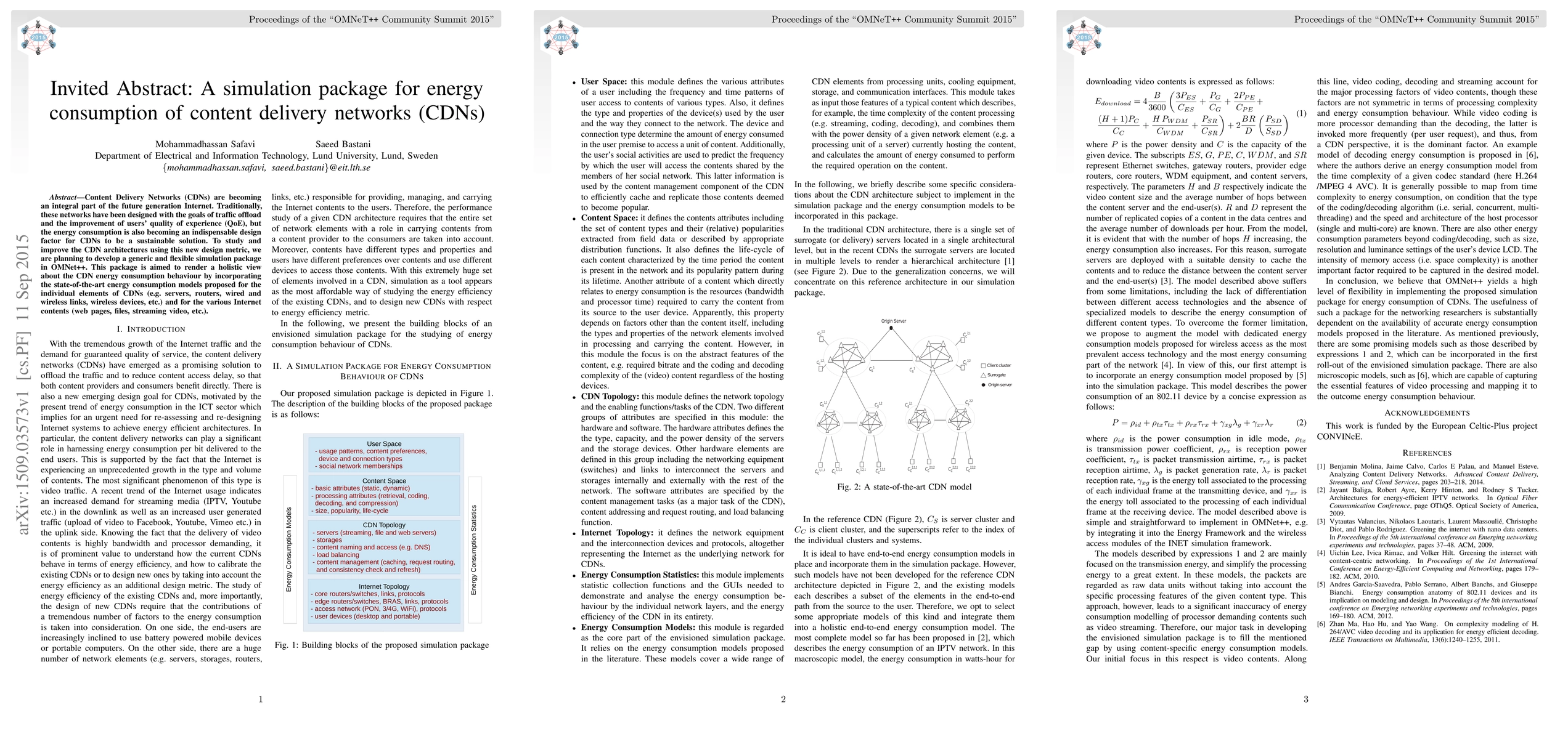 Content Delivery Networks (CDNs) are becoming an integral part of the future generation Internet. Traditionally, these networks have been designed with the goals of traffic offload and the improvement of users' quality of experience (QoE), but the energy consumption is also becoming an indispensable design factor for CDNs to be a sustainable solution. To study and improve the CDN architectures using this new design metric, we are planning to develop a generic and flexible simulation package in OMNet++. This package is aimed to render a holistic view about the CDN energy consumption behaviour by incorporating the state-of-the-art energy consumption models proposed for the individual elements of CDNs (e.g. servers, routers, wired and wireless links, wireless devices, etc.) and for the various Internet contents (web pages, files, streaming video, etc.).