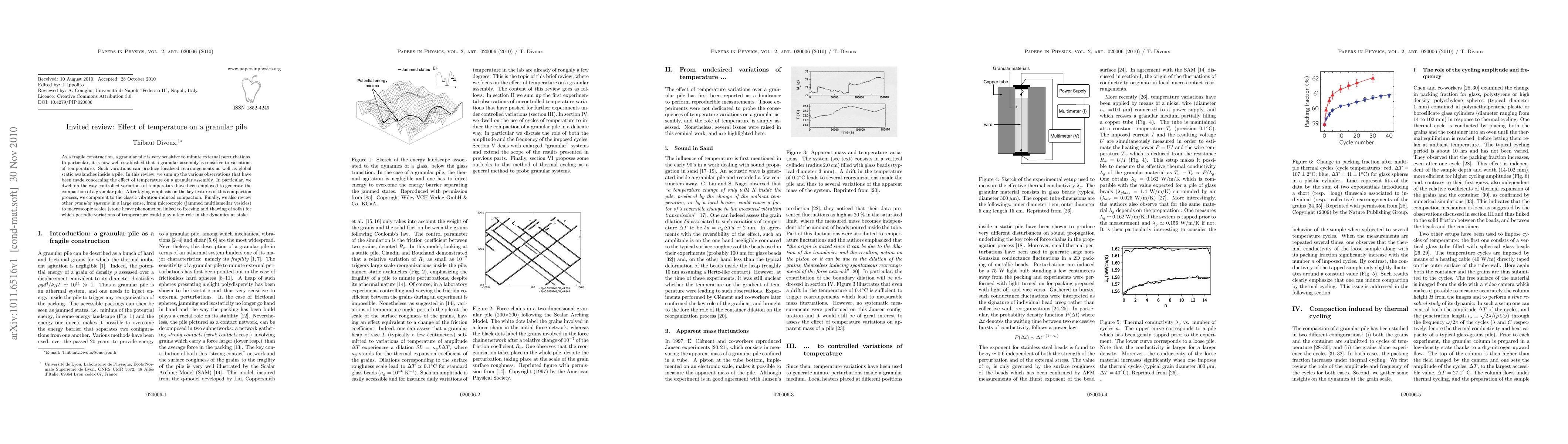 This review examines the impact of temperature variations on granular piles, highlighting how such changes induce rearrangements and compaction. It compares temperature-induced compaction to vibration-induced compaction and discusses the broader implications of temperature dynamics in various granular systems.