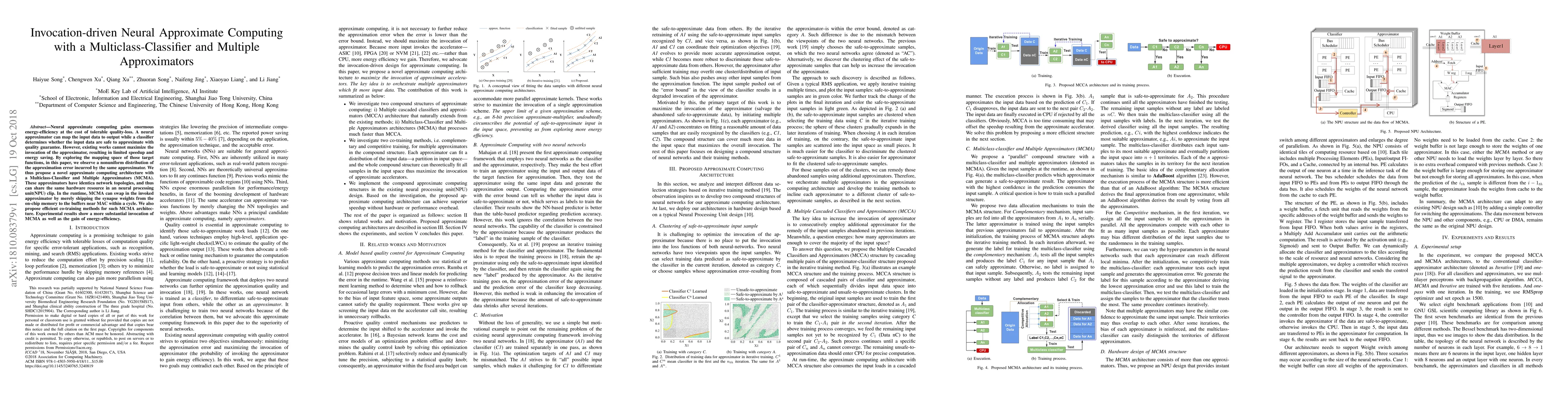 Neural approximate computing gains enormous energy-efficiency at the cost of tolerable quality-loss. A neural approximator can map the input data to output while a classifier determines whether the input data are safe to approximate with quality guarantee. However, existing works cannot maximize the invocation of the approximator, resulting in limited speedup and energy saving. By exploring the mapping space of those target functions, in this paper, we observe a nonuniform distribution of the approximation error incurred by the same approximator. We thus propose a novel approximate computing architecture with a Multiclass-Classifier and Multiple Approximators (MCMA). These approximators have identical network topologies and thus can share the same hardware resource in a neural processing unit(NPU) clip. In the runtime, MCMA can swap in the invoked approximator by merely shipping the synapse weights from the on-chip memory to the buffers near MAC within a cycle. We also propose efficient co-training methods for such MCMA architecture. Experimental results show a more substantial invocation of MCMA as well as the gain of energy-efficiency.