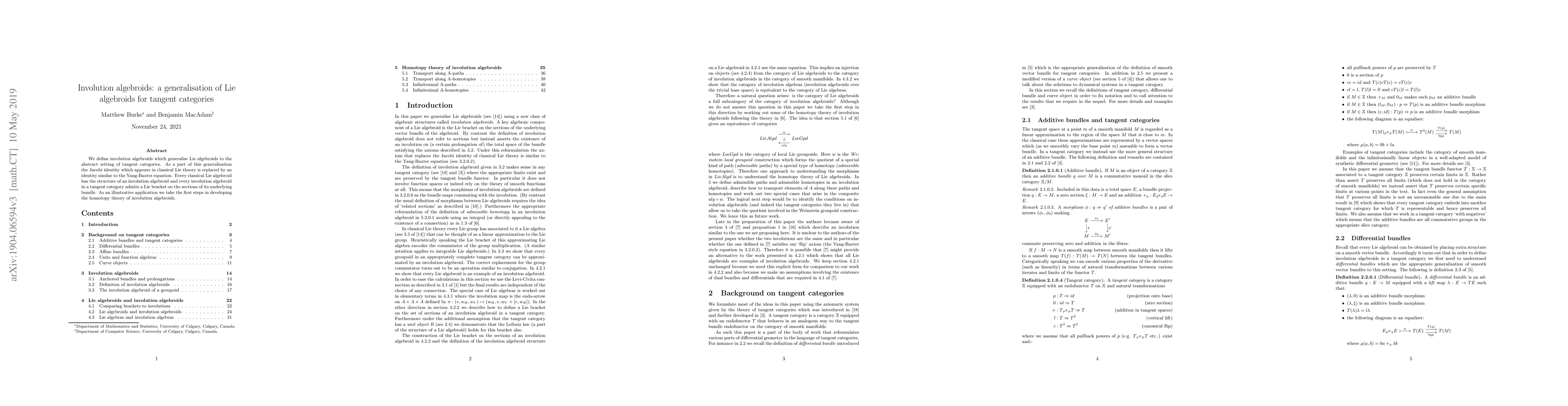 The paper defines involution algebroids as a generalization of Lie algebroids for tangent categories, replacing the Jacobi identity with an identity akin to the Yang-Baxter equation. It establishes that classical Lie algebroids fit within this new framework and explores initial steps in the homotopy theory of involution algebroids.