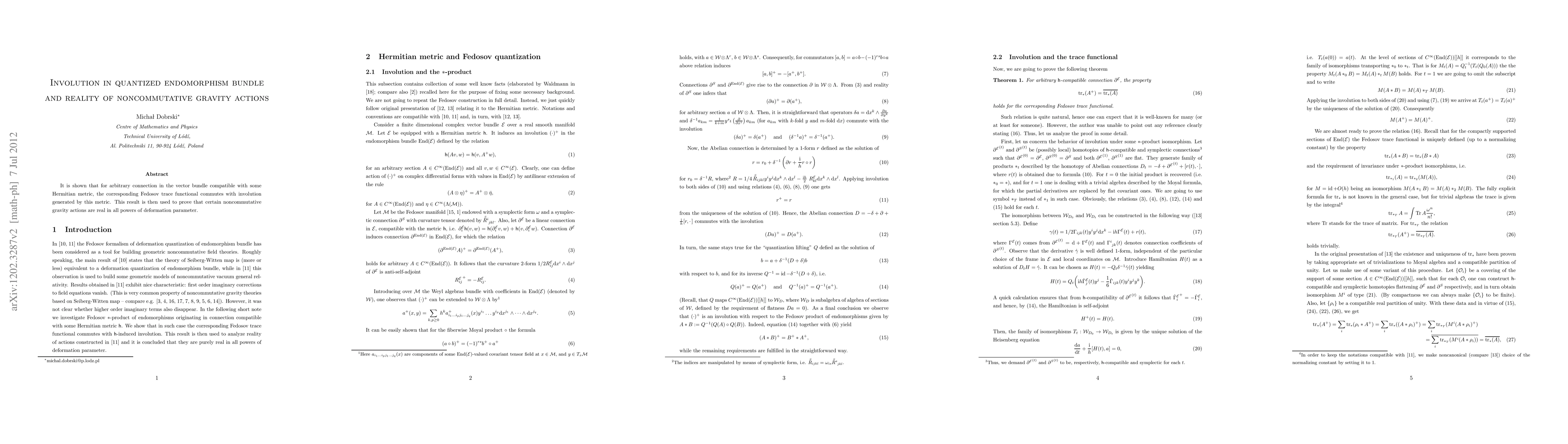 Summary: The paper demonstrates that the Fedosov trace functional commutes with involution in quantized endomorphism bundles, leading to the proof that specific noncommutative gravity actions remain real across all deformation parameters.