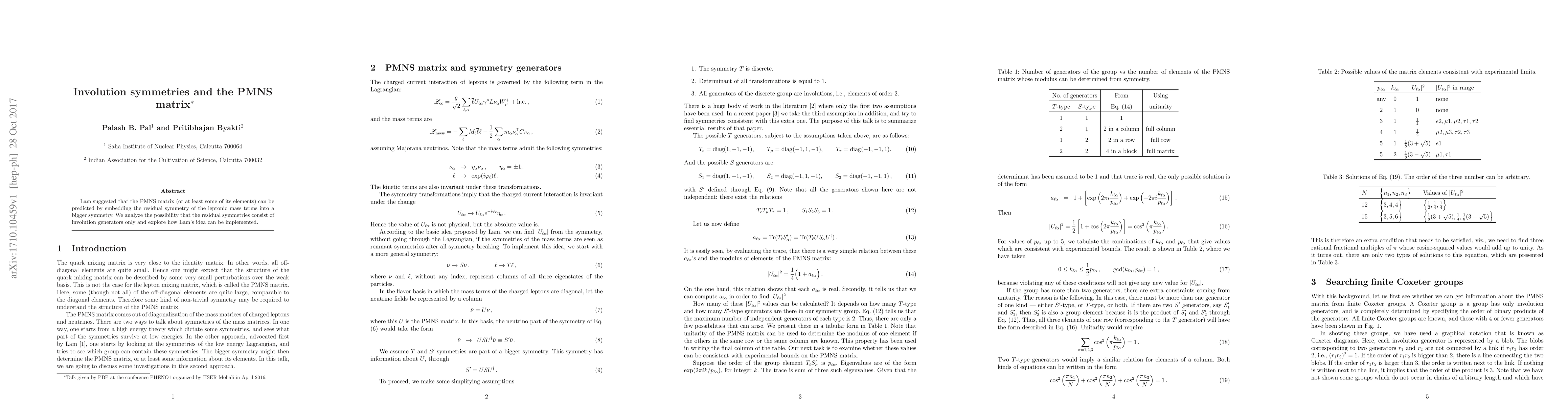 Lam suggested that the PMNS matrix (or at least some of its elements) can be predicted by embedding the residual symmetry of the leptonic mass terms into a bigger symmetry. We analyze the possibility that the residual symmetries consist of involution generators only and explore how Lam's idea can be implemented.