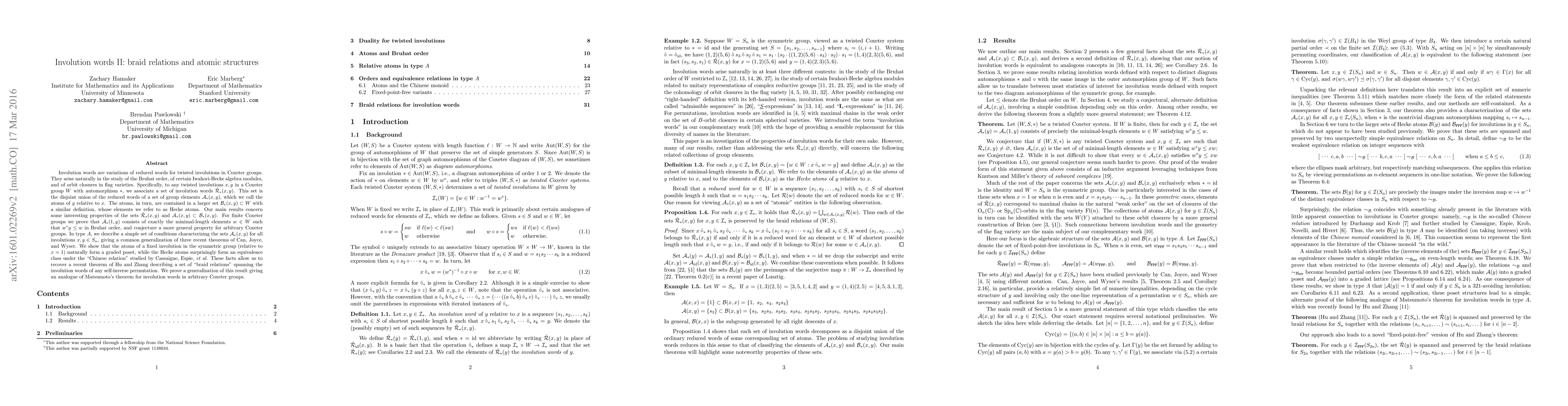 Involution words are variations of reduced words for twisted involutions in Coxeter groups. They arise naturally in the study of the Bruhat order, of certain Iwahori-Hecke algebra modules, and of orbit closures in flag varieties. Specifically, to any twisted involutions $x$, $y$ in a Coxeter group $W$ with automorphism $*$, we associate a set of involution words $\hat{\mathcal{R}}_*(x,y)$. This set is the disjoint union of the reduced words of a set of group elements $\mathcal{A}_*(x,y)$, which we call the atoms of $y$ relative to $x$. The atoms, in turn, are contained in a larger set $\mathcal{B}_*(x,y) \subset W$ with a similar definition, whose elements we refer to as Hecke atoms. Our main results concern some interesting properties of the sets $\hat{\mathcal{R}}_*(x,y)$ and $\mathcal{A}_*(x,y) \subset \mathcal{B}_*(x,y)$. For finite Coxeter groups we prove that $\mathcal{A}_*(1,y)$ consists of exactly the minimal-length elements $w \in W$ such that $w^* y \leq w$ in Bruhat order, and conjecture a more general property for arbitrary Coxeter groups. In type $A$, we describe a simple set of conditions characterizing the sets $\mathcal{A}_*(x,y)$ for all involutions $x,y \in S_n$, giving a common generalization of three recent theorems of Can, Joyce, and Wyser. We show that the atoms of a fixed involution in the symmetric group (relative to $x=1$) naturally form a graded poset, while the Hecke atoms surprisingly form an equivalence class under the "Chinese relation" studied by Cassaigne, Espie, et al. These facts allow us to recover a recent theorem of Hu and Zhang describing a set of "braid relations" spanning the involution words of any self-inverse permutation. We prove a generalization of this result giving an analogue of Matsumoto's theorem for involution words in arbitrary Coxeter groups.