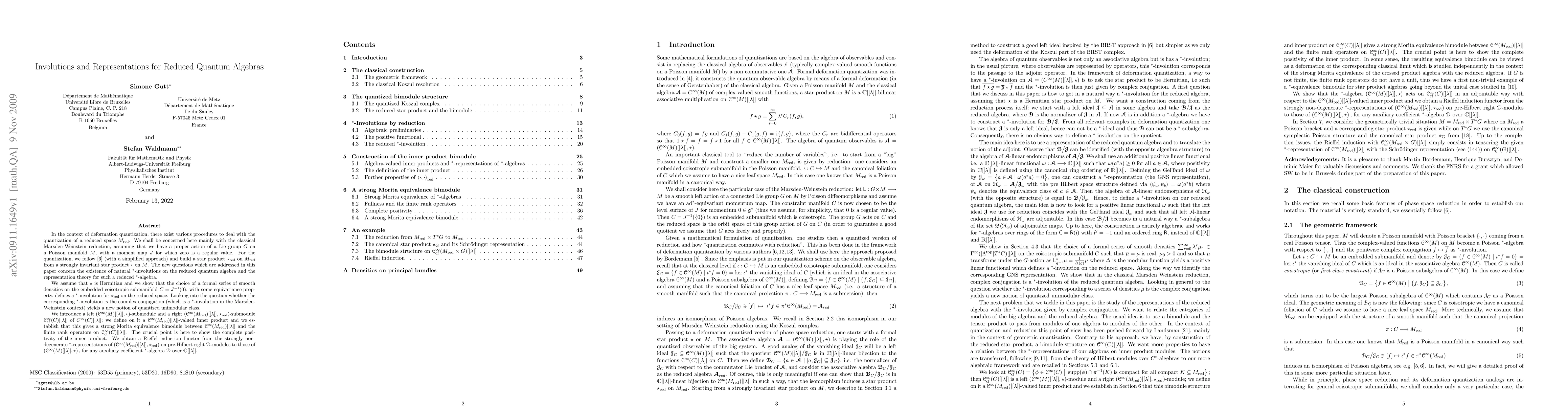 In the context of deformation quantization, there exist various procedures to deal with the quantization of a reduced space M_red. We shall be concerned here mainly with the classical Marsden-Weinstein reduction, assuming that we have a proper action of a Lie group G on a Poisson manifold M, with a moment map J for which zero is a regular value. For the quantization, we follow [BHW] (with a simplified approach) and build a star product *_red on M_red from a strongly invariant star product * on M. The new questions which are addressed in this paper concern the existence of natural *-involutions on the reduced quantum algebra and the representation theory for such a reduced *-algebra. We assume that * is Hermitian and we show that the choice of a formal series of smooth densities on the embedded coisotropic submanifold C = J^{-1}(0), with some equivariance property, defines a *-involution for *_red on the reduced space. Looking into the question whether the corresponding *-involution is the complex conjugation (which is a *-involution in the Marsden-Weinstein context) yields a new notion of quantized unimodular class. We introduce a left *-submodule and a right *_red-submodule C^\infty_cf(C)[[lambda]] of C^\infty(C)[[lambda]]; we define on it a C^\infty(M_red)[[lambda]]-valued inner product and we establish that this gives a strong Morita equivalence bimodule between C^\infty(M_red)[[lambda]] and the finite rank operators on C^\inftycf(C)[[lambda]]. The crucial point is here to show the complete positivity of the inner product. We obtain a Rieffel induction functor from the strongly non-degenerate *-representations of (C^\infty(M_red)[[lambda]], *_red) on pre-Hilbert right D-modules to those of (C^\infty(M)[[lambda]], *), for any auxiliary coefficient *-algebra D over \mathbb{C}[[lambda]].