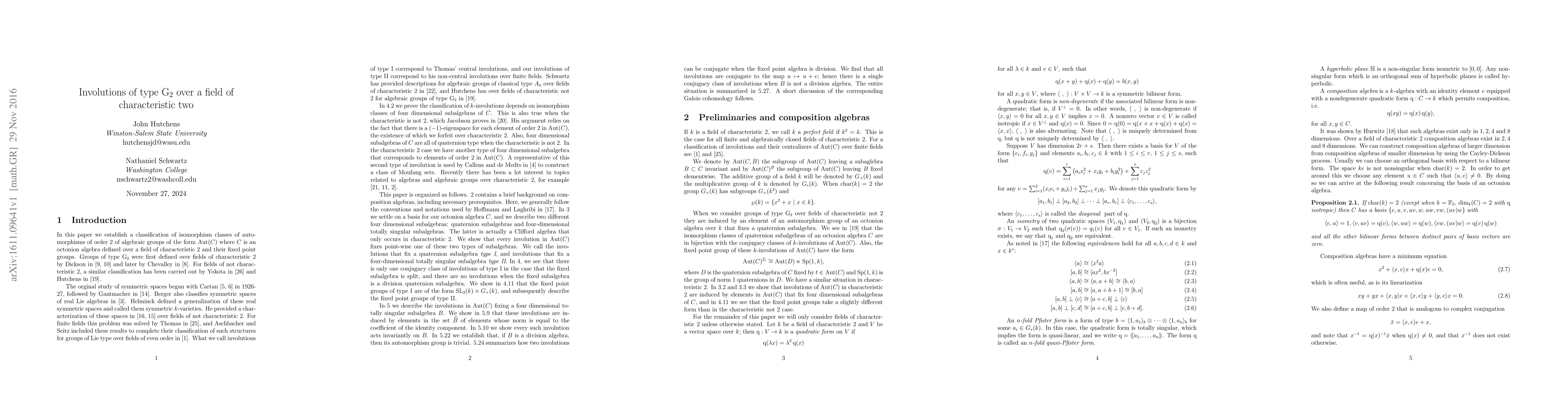 This paper classifies involutions of type $G_2$ in the automorphism group of an octonion algebra over fields of characteristic 2, and details the corresponding fixed point groups for each class.