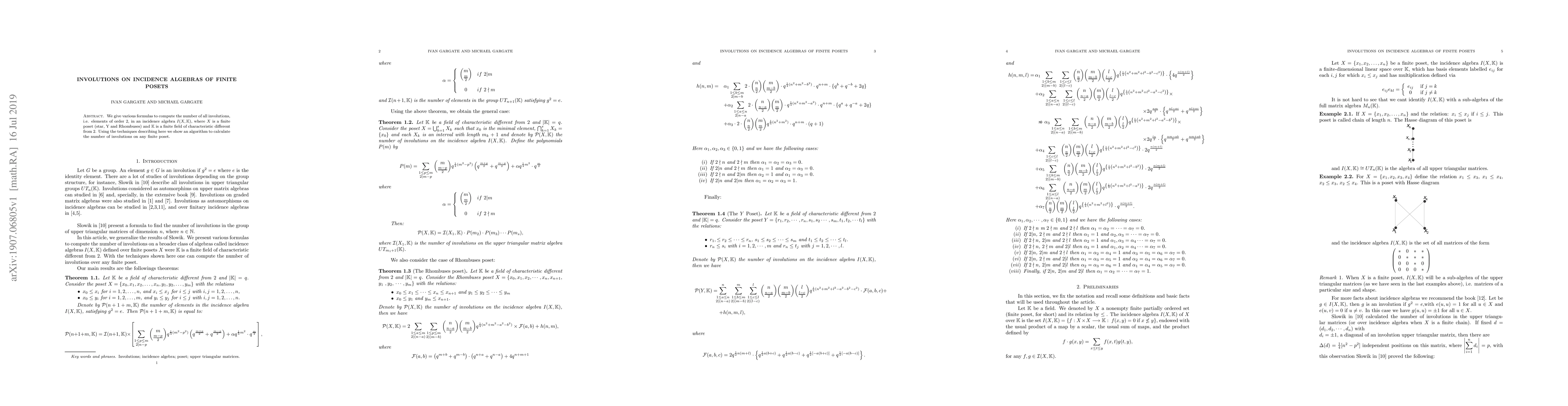 We give various formulas to compute the number of all involutions, i.e. elements of order 2, in an incidence algebra $I(X,\mathbb{K})$, where $X$ is a finite poset (star, Y and Rhombuses) and $\mathbb{K}$ is a finite field of characteristic different from 2. Using the techniques describing here we show an algorithm to calculate the number of involutions on any finite poset.