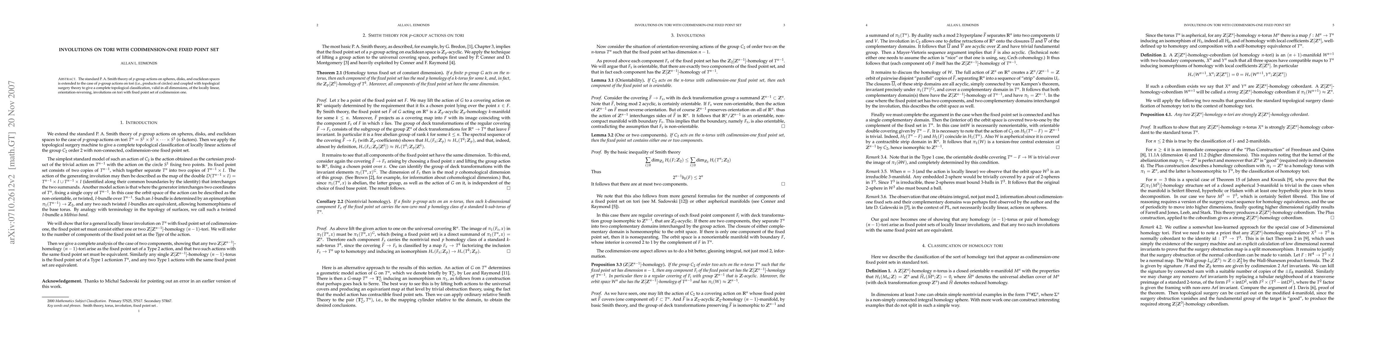 This paper extends the P. A. Smith theory for p-group actions to tori and uses topological surgery to classify locally linear, orientation-reversing involutions on tori with fixed point sets of codimension one across all dimensions.