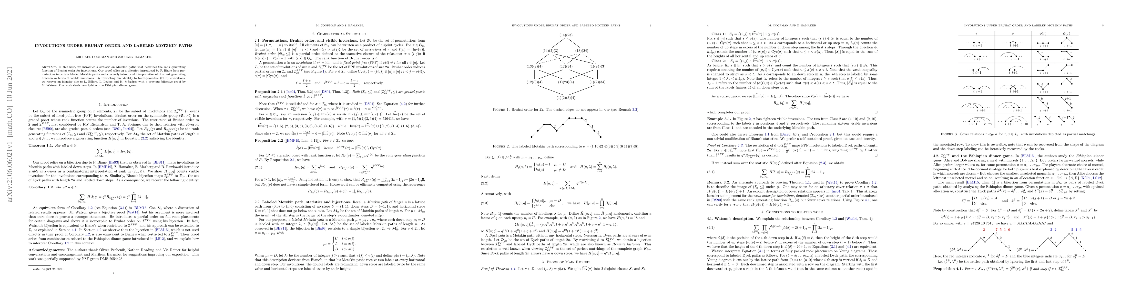 This paper introduces a statistic on labeled Motzkin paths that characterizes the rank generating function for involutions under Bruhat order, utilizing a bijection from permutations to these paths. It also provides new insights into the Ethiopian dinner game through the study of fixed-point-free involutions.