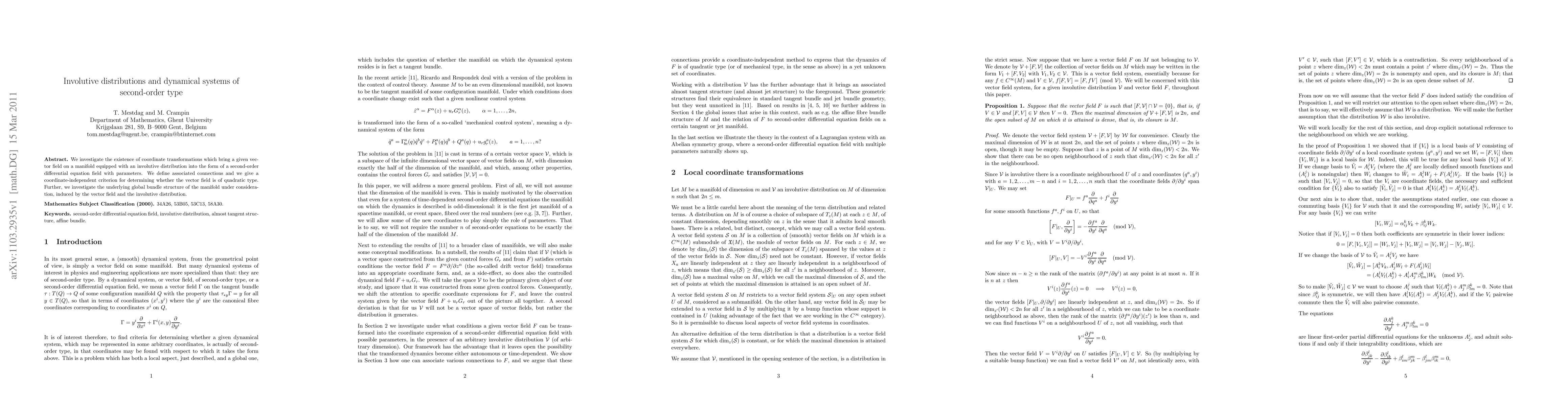 Researchers investigate coordinate transformations that convert a vector field with an involutive distribution into a second-order differential equation field with parameters, shedding light on the global bundle structure of the manifold.