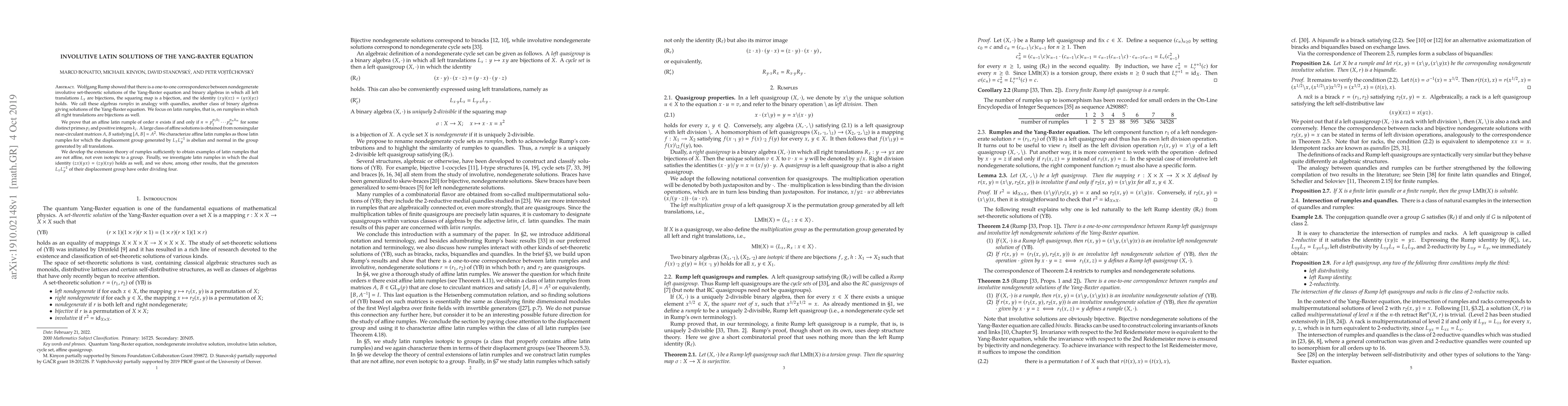 Wolfgang Rump showed that there is a one-to-one correspondence between nondegenerate involutive set-theoretic solutions of the Yang-Baxter equation and binary algebras in which all left translations $L_x$ are bijections, the squaring map is a bijection, and the identity $(xy)(xz) = (yx)(yz)$ holds. We call these algebras \emph{rumples} in analogy with quandles, another class of binary algebras giving solutions of the Yang-Baxter equation. We focus on latin rumples, that is, on rumples in which all right translations are bijections as well. We prove that an affine latin rumple of order $n$ exists if and only if $n=p_1^{p_1 k_1}\cdots p_m^{p_m k_m}$ for some distinct primes $p_i$ and positive integers $k_i$. A large class of affine solutions is obtained from nonsingular near-circulant matrices $A$, $B$ satisfying $[A,B]=A^2$. We characterize affine latin rumples as those latin rumples for which the displacement group generated by $L_x L_y\inv$ is abelian and normal in the group generated by all translations. We develop the extension theory of rumples sufficiently to obtain examples of latin rumples that are not affine, not even isotopic to a group. Finally, we investigate latin rumples in which the dual identity $(zx)(yx) = (zy)(xy)$ holds as well, and we show, among other results, that the generators $L_x L_y\inv$ of their displacement group have order dividing four.