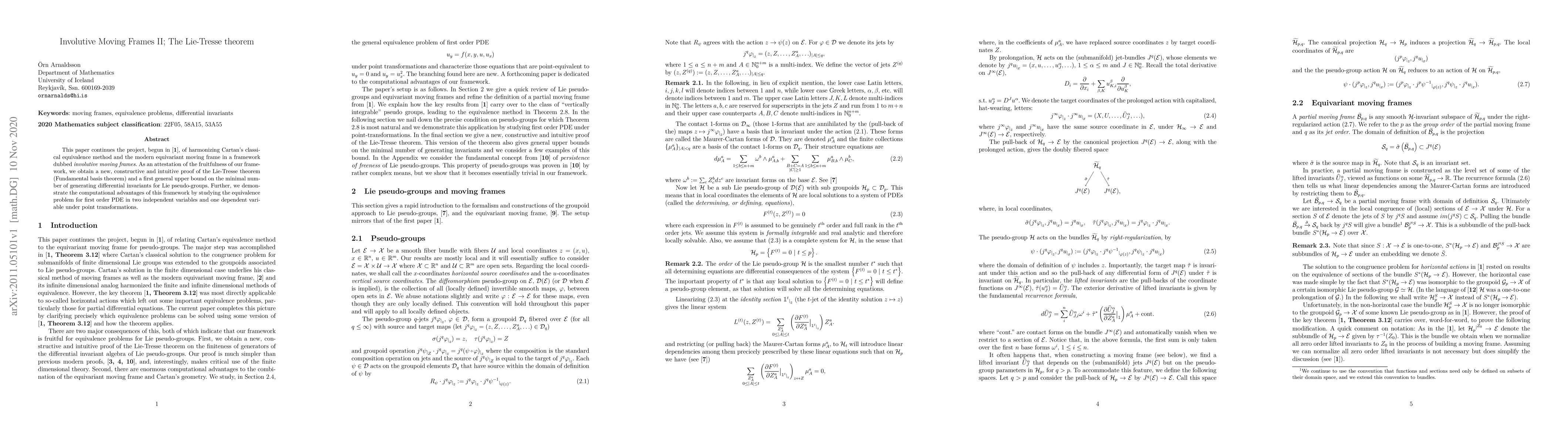 This paper continues the project, begun in \cite{IMF}, of harmonizing Cartan's classical equivalence method and the modern equivariant moving frame in a framework dubbed \emph{involutive moving frames}. As an attestation of the fruitfulness of our framework, we obtain a new, constructive and intuitive proof of the Lie-Tresse theorem (Fundamental basis theorem) and a first general upper bound on the minimal number of generating differential invariants for Lie pseudo-groups. Further, we demonstrate the computational advantages of this framework by studying the equivalence problem for first order PDE in two independent variables and one dependent variable under point transformations.