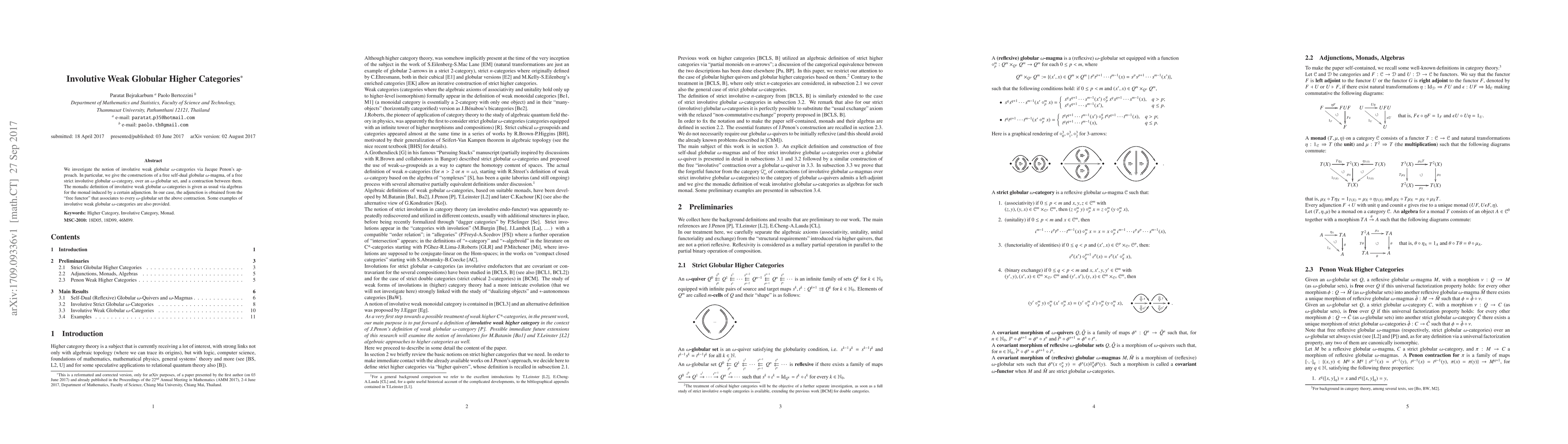 We investigate the notion of involutive weak globular $\omega$-categories via Jacque Penon's approach. In particular, we give the constructions of a free self-dual globular $\omega$-magma, of a free strict involutive globular $\omega$-category, over an $\omega$-globular set, and a contraction between them. The monadic definition of involutive weak globular $\omega$-categories is given as usual via algebras for the monad induced by a certain adjunction. In our case, the adjunction is obtained from the "free functor" that associates to every $\omega$-globular set the above contraction. Some examples of involutive weak globular $\omega$-categories are also provided.