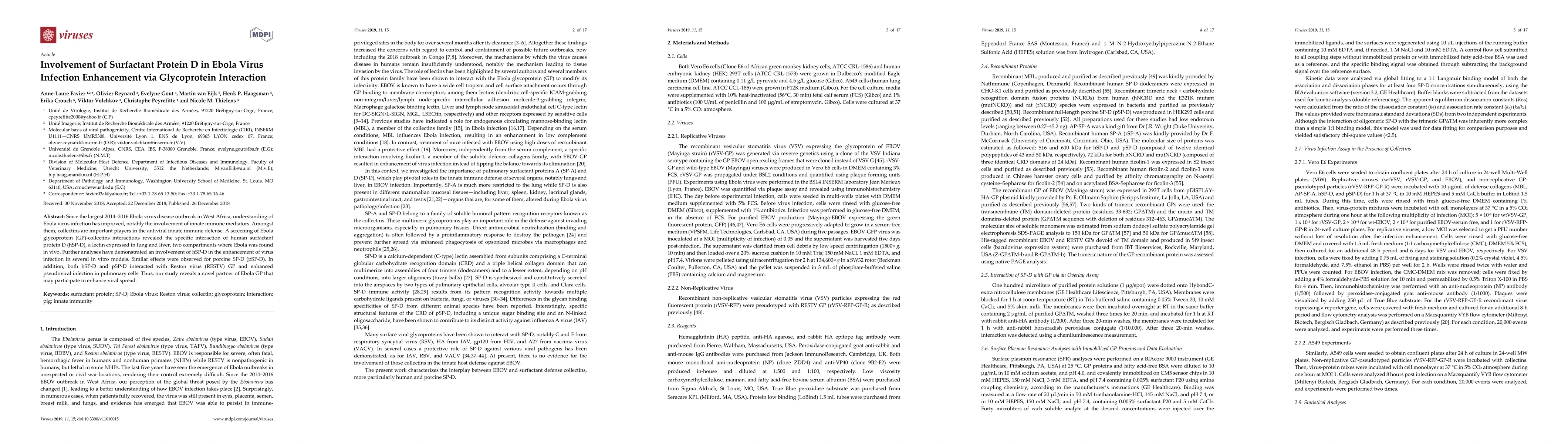 This study identifies human surfactant protein D (hSP-D) as an enhancer of Ebola virus infection via its interaction with the viral glycoprotein. Both hSP-D and porcine SP-D were found to similarly enhance infection, suggesting a broader role in viral spread.