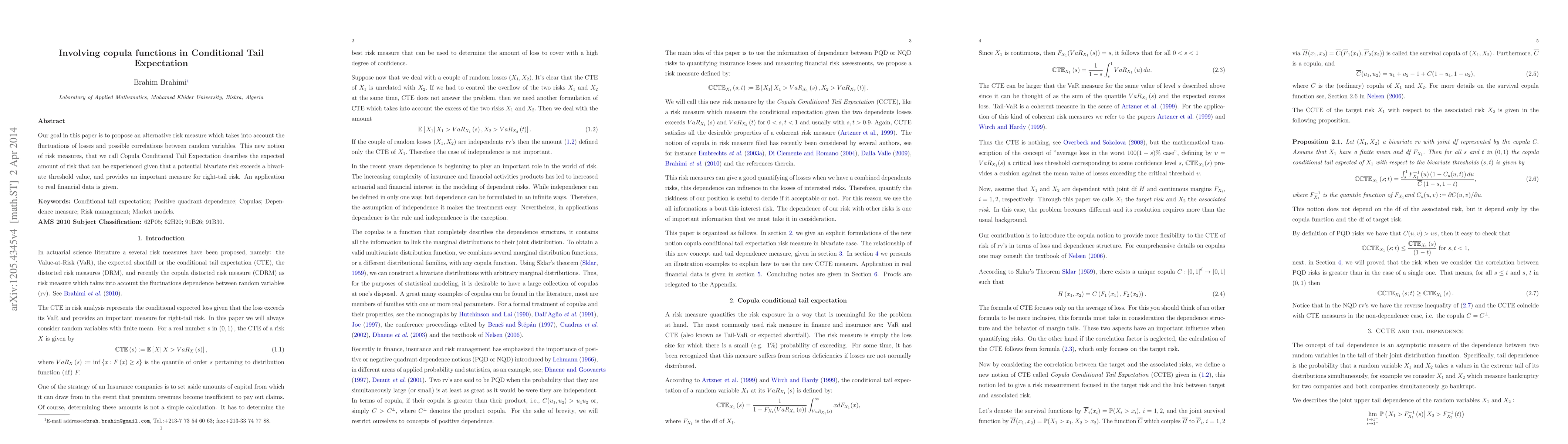 Our goal in this paper is to propose an alternative risk measure which takes into account the fluctuations of losses and possible correlations between random variables. This new notion of risk measures, that we call Copula Conditional Tail Expectation describes the expected amount of risk that can be experienced given that a potential bivariate risk exceeds a bivariate threshold value, and provides an important measure for right-tail risk. An application to real financial data is given.