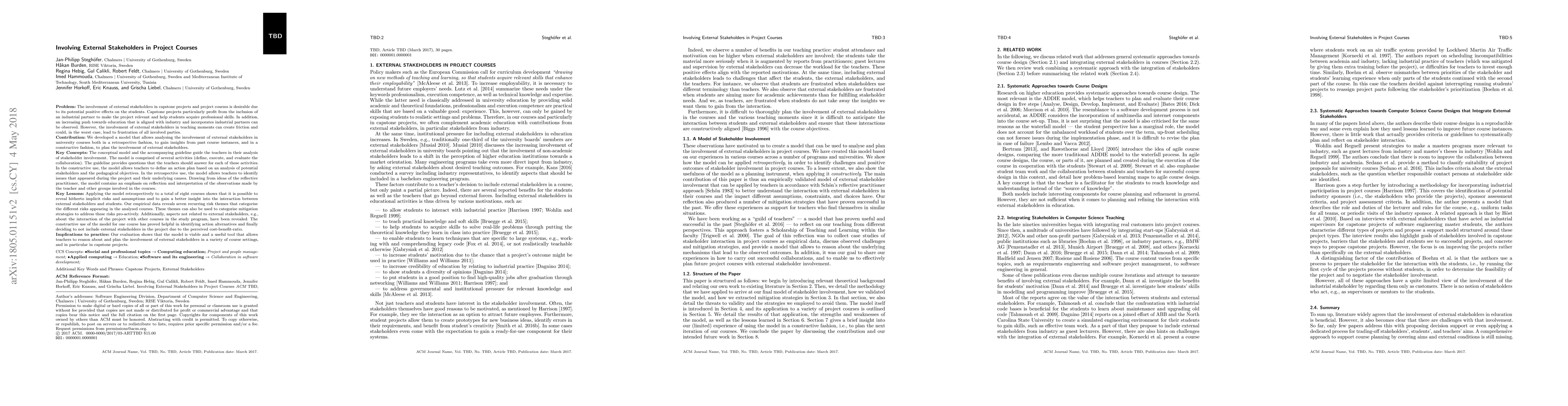Problem: The involvement of external stakeholders in capstone projects and project courses is desirable due to its potential positive effects on the students. Capstone projects particularly profit from the inclusion of an industrial partner to make the project relevant and help students acquire professional skills. In addition, an increasing push towards education that is aligned with industry and incorporates industrial partners can be observed. However, the involvement of external stakeholders in teaching moments can create friction and could, in the worst case, lead to frustration of all involved parties. Contribution: We developed a model that allows analysing the involvement of external stakeholders in university courses both in a retrospective fashion, to gain insights from past course instances, and in a constructive fashion, to plan the involvement of external stakeholders. Key Concepts: The conceptual model and the accompanying guideline guide the teachers in their analysis of stakeholder involvement. The model is comprised of several activities (define, execute, and evaluate the collaboration). The guideline provides questions that the teachers should answer for each of these activities. In the constructive use, the model allows teachers to define an action plan based on an analysis of potential stakeholders and the pedagogical objectives. In the retrospective use, the model allows teachers to identify issues that appeared during the project and their underlying causes. Drawing from ideas of the reflective practitioner, the model contains an emphasis on reflection and interpretation of the observations made by the teacher and other groups involved in the courses. Key Lessons: Applying the model retrospectively to a total of eight courses shows that it is possible to reveal hitherto implicit risks and assumptions and to gain a better insight into the interaction...