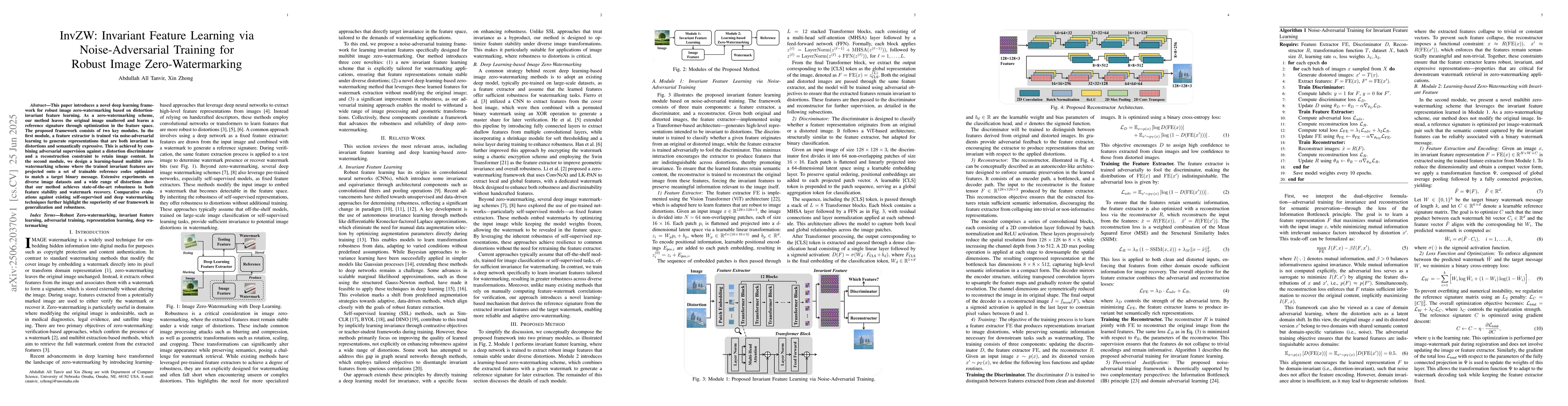 This paper introduces a novel deep learning framework for robust image zero-watermarking based on distortion-invariant feature learning. As a zero-watermarking scheme, our method leaves the original image unaltered and learns a reference signature through optimization in the feature space. The proposed framework consists of two key modules. In the first module, a feature extractor is trained via noise-adversarial learning to generate representations that are both invariant to distortions and semantically expressive. This is achieved by combining adversarial supervision against a distortion discriminator and a reconstruction constraint to retain image content. In the second module, we design a learning-based multibit zero-watermarking scheme where the trained invariant features are projected onto a set of trainable reference codes optimized to match a target binary message. Extensive experiments on diverse image datasets and a wide range of distortions show that our method achieves state-of-the-art robustness in both feature stability and watermark recovery. Comparative evaluations against existing self-supervised and deep watermarking techniques further highlight the superiority of our framework in generalization and robustness.