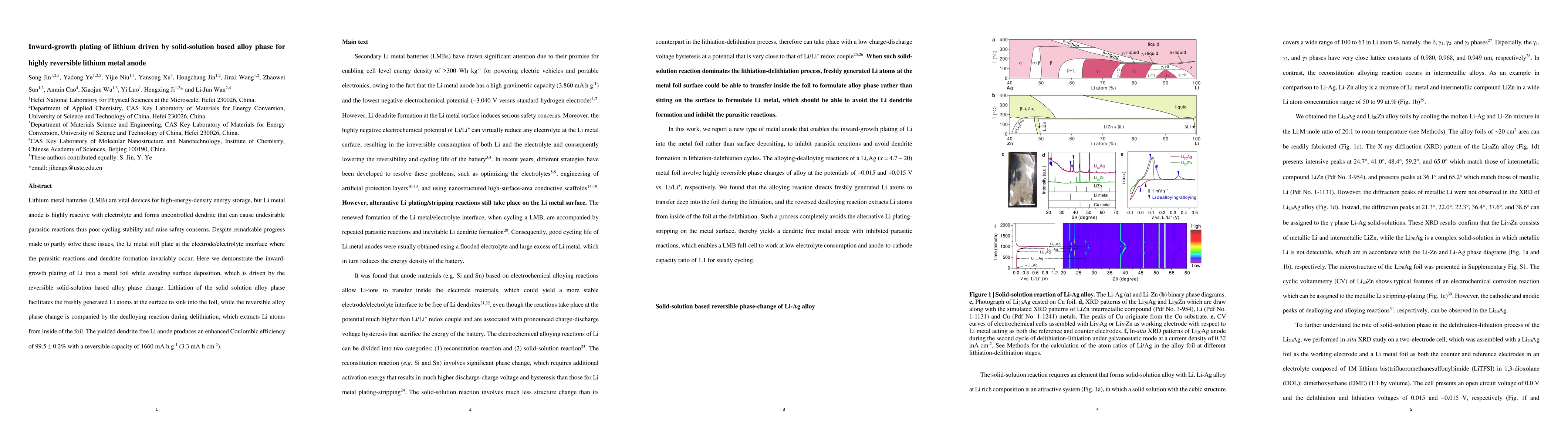 This paper presents a method for inward-growth plating of lithium in a solid-solution alloy phase, avoiding surface deposition and dendrite formation in lithium metal anodes. The technique achieves a high Coulombic efficiency of 99.5 ± 0.2% and a reversible capacity of 1660 mA h g$^{-1}$.