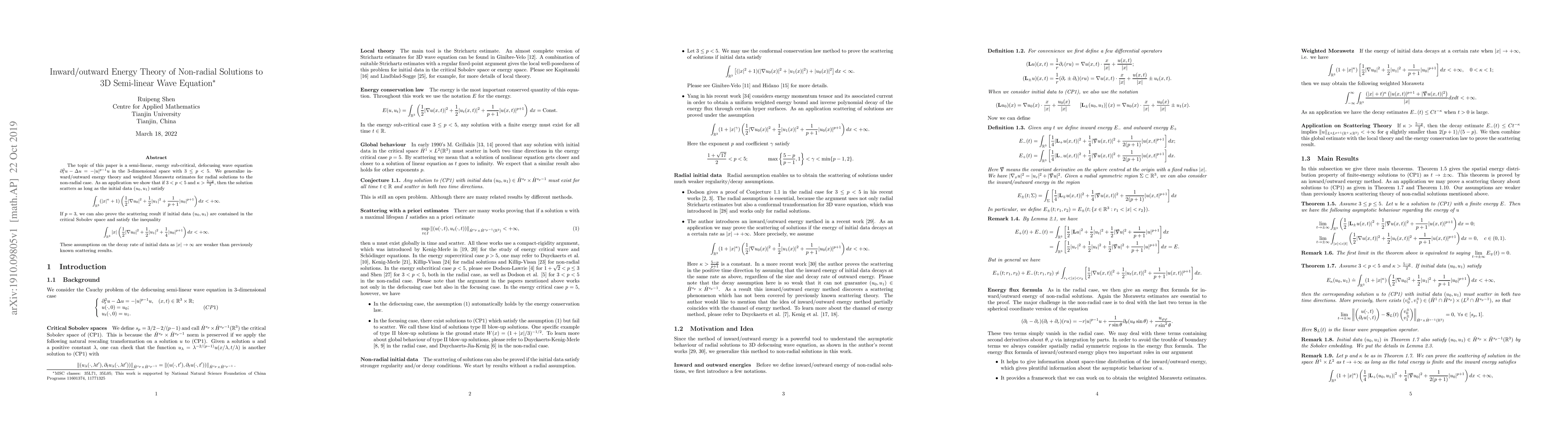The topic of this paper is a semi-linear, energy sub-critical, defocusing wave equation $\partial_t^2 u - \Delta u = - |u|^{p -1} u$ in the 3-dimensional space with $3\leq p<5$. We generalize inward/outward energy theory and weighted Morawetz estimates for radial solutions to the non-radial case. As an application we show that if $3