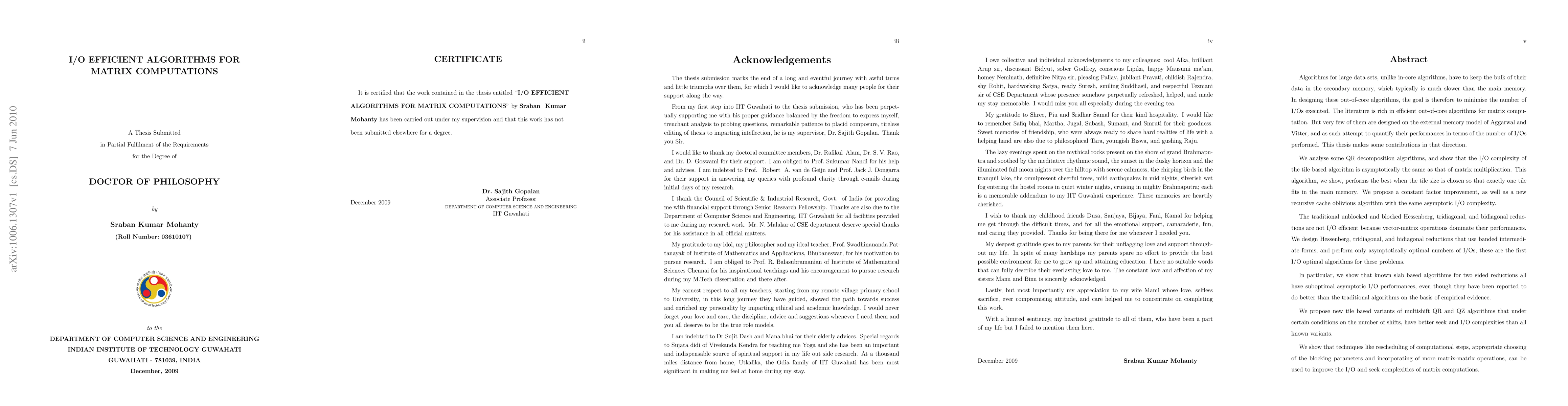 We analyse some QR decomposition algorithms, and show that the I/O complexity of the tile based algorithm is asymptotically the same as that of matrix multiplication. This algorithm, we show, performs the best when the tile size is chosen so that exactly one tile fits in the main memory. We propose a constant factor improvement, as well as a new recursive cache oblivious algorithm with the same asymptotic I/O complexity. We design Hessenberg, tridiagonal, and bidiagonal reductions that use banded intermediate forms, and perform only asymptotically optimal numbers of I/Os; these are the first I/O optimal algorithms for these problems. In particular, we show that known slab based algorithms for two sided reductions all have suboptimal asymptotic I/O performances, even though they have been reported to do better than the traditional algorithms on the basis of empirical evidence. We propose new tile based variants of multishift QR and QZ algorithms that under certain conditions on the number of shifts, have better seek and I/O complexities than all known variants. We show that techniques like rescheduling of computational steps, appropriate choosing of the blocking parameters and incorporating of more matrix-matrix operations, can be used to improve the I/O and seek complexities of matrix computations.