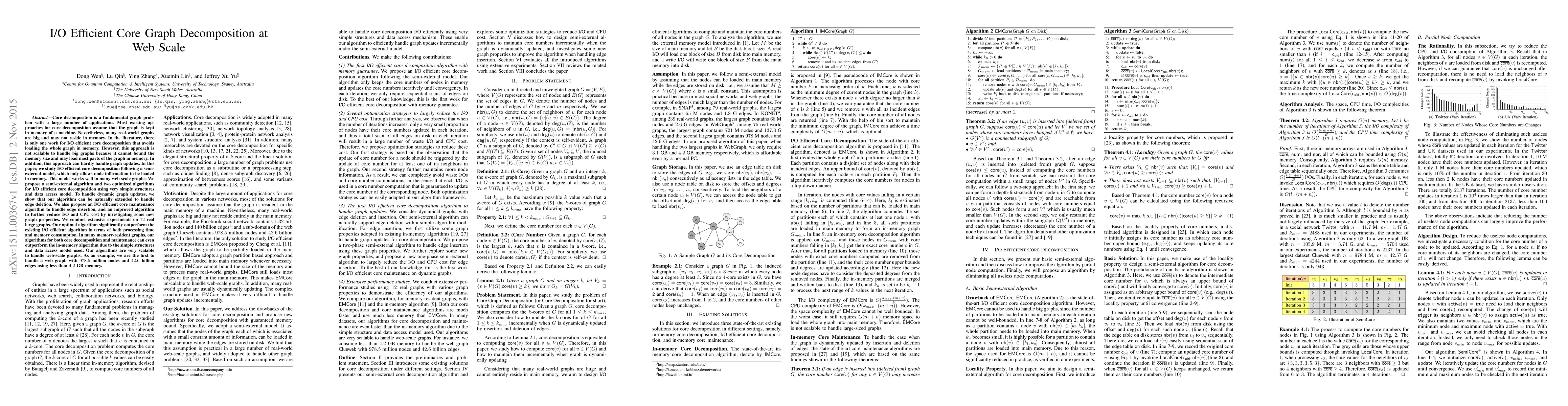 This paper proposes I/O efficient algorithms for core graph decomposition in web-scale graphs, which do not require loading the entire graph into memory. The authors introduce a semi-external model, presenting optimized algorithms for static core decomposition and dynamic updates, demonstrating significant performance improvements over existing methods.