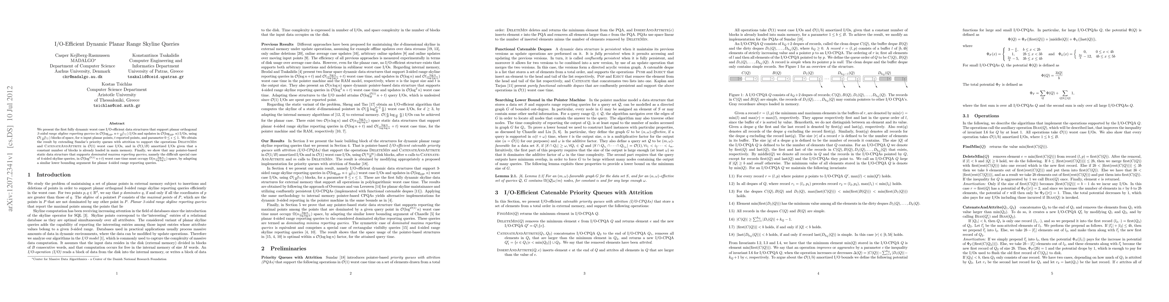We present the first fully dynamic worst case I/O-efficient data structures that support planar orthogonal \textit{3-sided range skyline reporting queries} in $\bigO (\log_{2B^\epsilon} n + \frac{t}{B^{1-\epsilon}})$ I/Os and updates in $\bigO (\log_{2B^\epsilon} n)$ I/Os, using $\bigO (\frac{n}{B^{1-\epsilon}})$ blocks of space, for $n$ input planar points, $t$ reported points, and parameter $0 \leq \epsilon \leq 1$. We obtain the result by extending Sundar's priority queues with attrition to support the operations \textsc{DeleteMin} and \textsc{CatenateAndAttrite} in $\bigO (1)$ worst case I/Os, and in $\bigO(1/B)$ amortized I/Os given that a constant number of blocks is already loaded in main memory. Finally, we show that any pointer-based static data structure that supports \textit{dominated maxima reporting queries}, namely the difficult special case of 4-sided skyline queries, in $\bigO(\log^{\bigO(1)}n +t)$ worst case time must occupy $\Omega(n \frac{\log n}{\log \log n})$ space, by adapting a similar lower bounding argument for planar 4-sided range reporting queries.