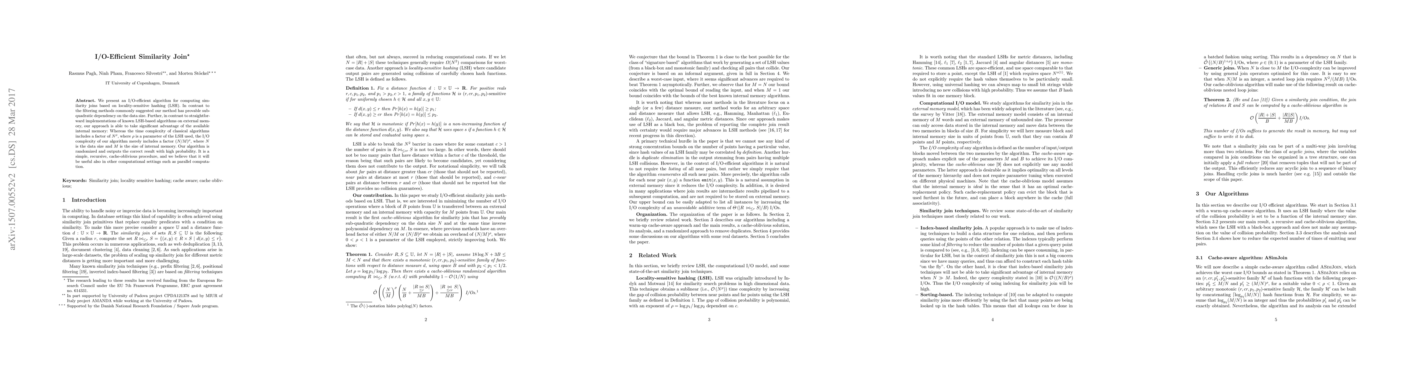 This paper presents an I/O-efficient algorithm for similarity joins using locality-sensitive hashing, achieving sub-quadratic dependency on data size while leveraging internal memory to reduce I/O complexity.